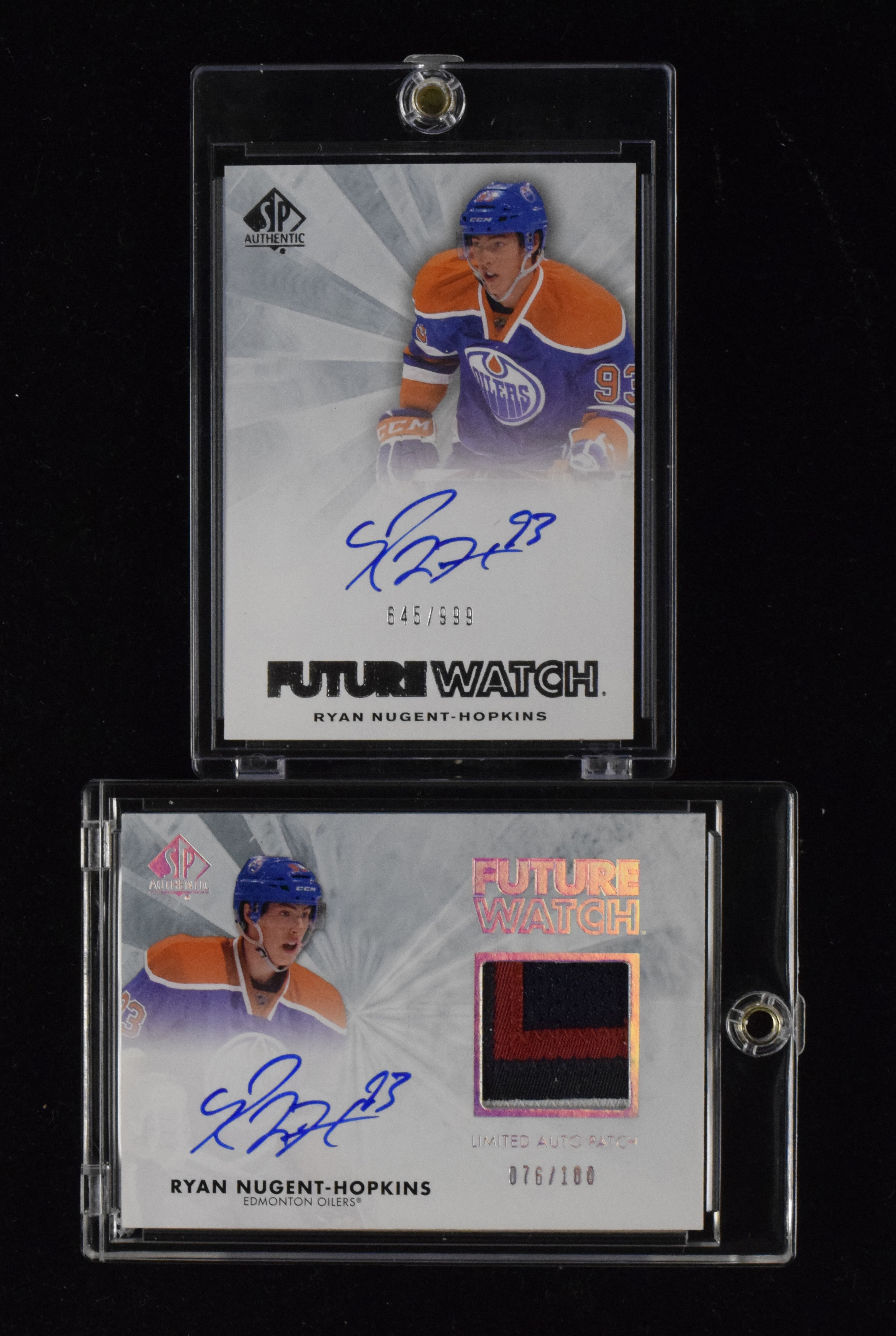 Description:Lot of (2) Ryan Nugent-Hopkins signed 2011-12 SP Authentic serial #ed rookie cards including patch auto (NM-NM/MT). Includes 2011-12 SP Authentic #248 signed by Nugent-Hopkins (#ed 645/999), and 2011-12 SP Authentic "Limited Auto Patches" #248 signed by Nugent-Hopkins (#ed 76/100). Signatures rate 9 to 10 out of 10: NM-NM/MT