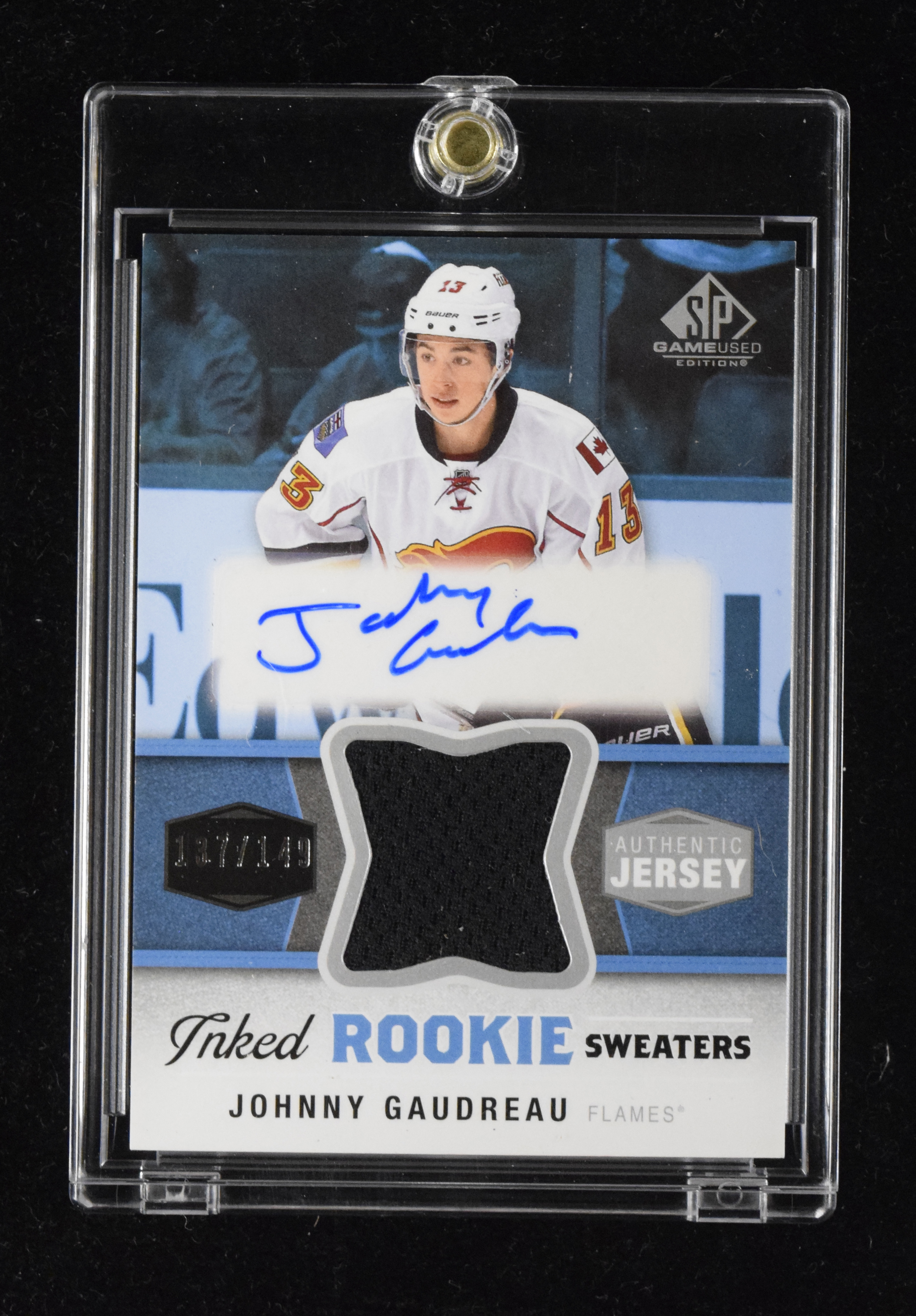 Description:Johnny Gaudreau signed 2014-15 SP Game Used serial #ed rookie relic insert card (NM). 2014-15 SP Game Used "Inked Rookie Sweaters" #IRS-JG signed by Gaudreau in blue marker. Signature rates 9 out of 10. The card is #ed 137/149: NM
