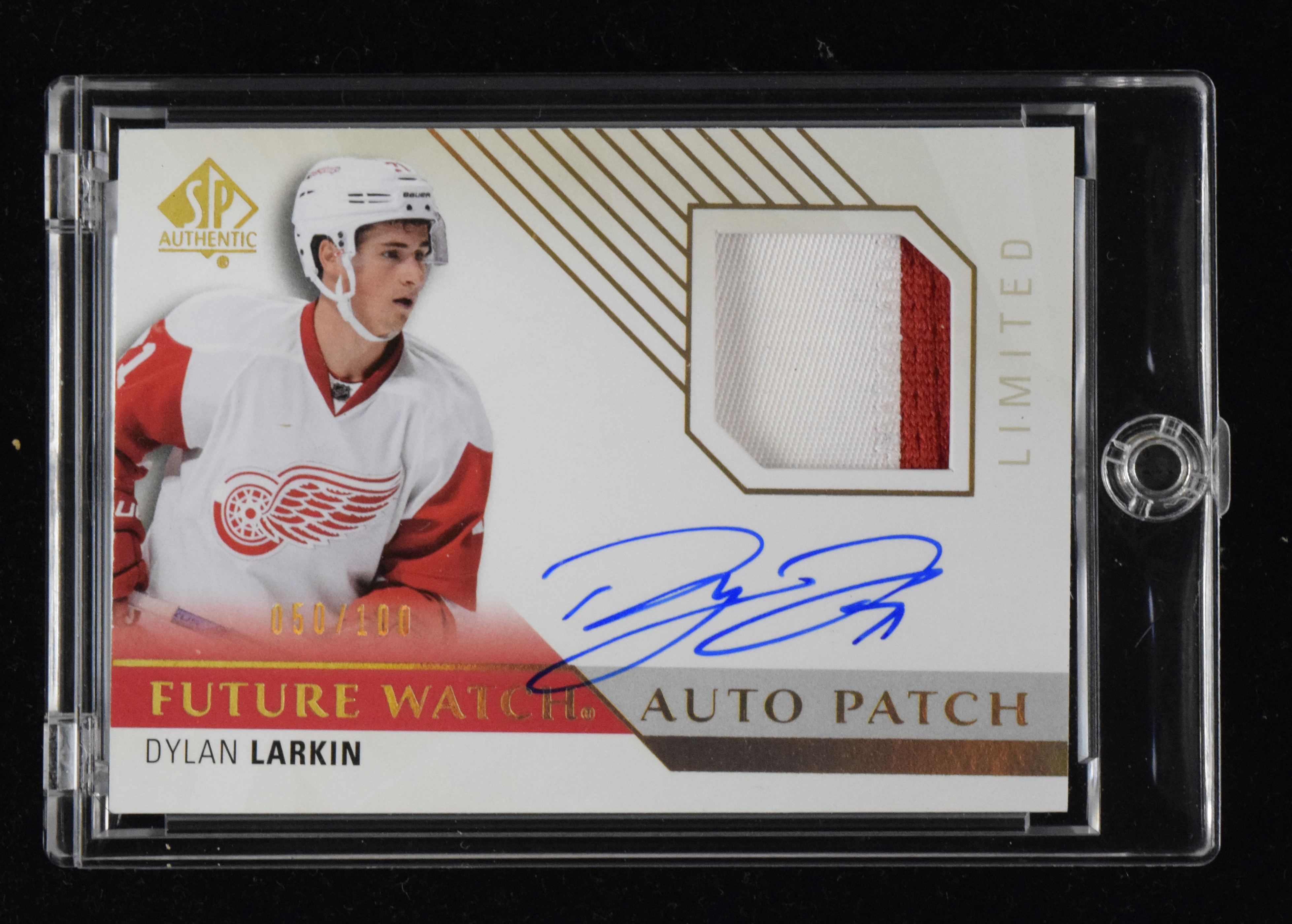 Description:Dylan Larkin signed 2015-16 SP Authentic serial #ed rookie patch autograph card (NM/MT). 2015-16 SP Authentic "Limited Auto Patches" #260 signed by Larkin in blue marker. Signature rates 9/10 out of 10. The card is numbered 50/100: NM/MT
