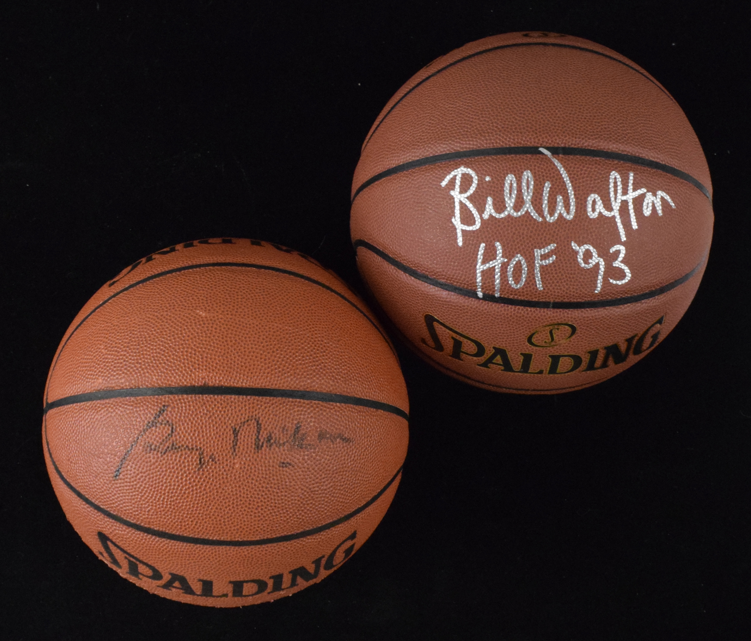 Description:George Mikan and Bill Walton signed basketballs (VG-NM). Includes a Spalding NBA indoor/outdoor ball signed by George Mikan in black marker rating 7/8 out of 10 (VG areas of surface loss), and Spalding "Max Grip" ball signed by Bill Walton in silver marker with "HOF 93" inscription rating 9 out of 10 (Schwartz Sports): VG-NM