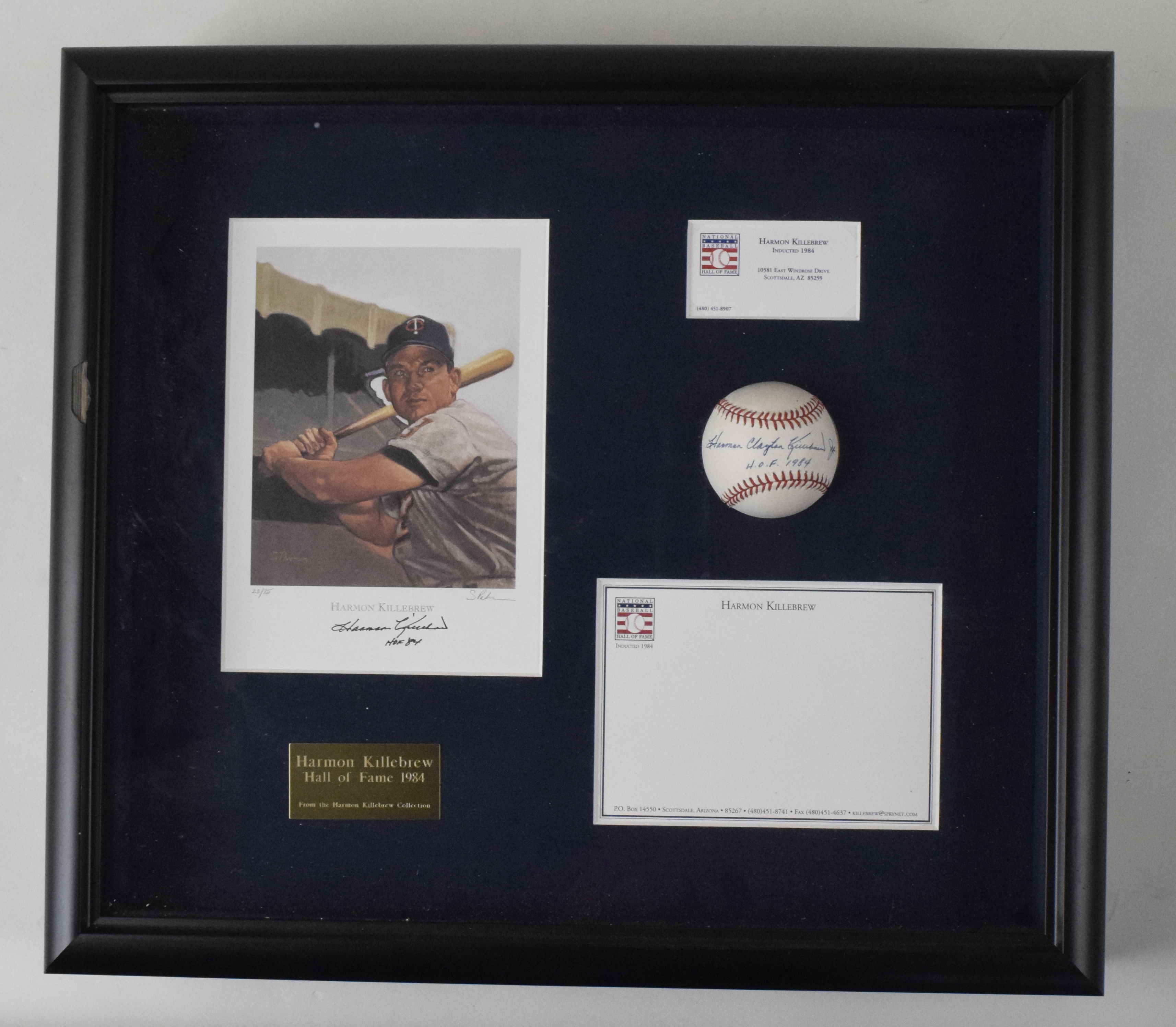Description:Harmon Killebrew shadow box display including autographs (NM). Approx. 18.5"x21" shadow box containing a baseball full name signed by Harmon Clayton Killebrew Jr with "HOF 1984" inscription, a print signed by Killebrew with "HOF 84" inscription (#ed 23/75), a Killebrew business card, sheet of Killebrew's personal stationery, and a placard stating "From The Harmon Killebrew Collection". Due to framing, complete conditions are unknown: NM appearance