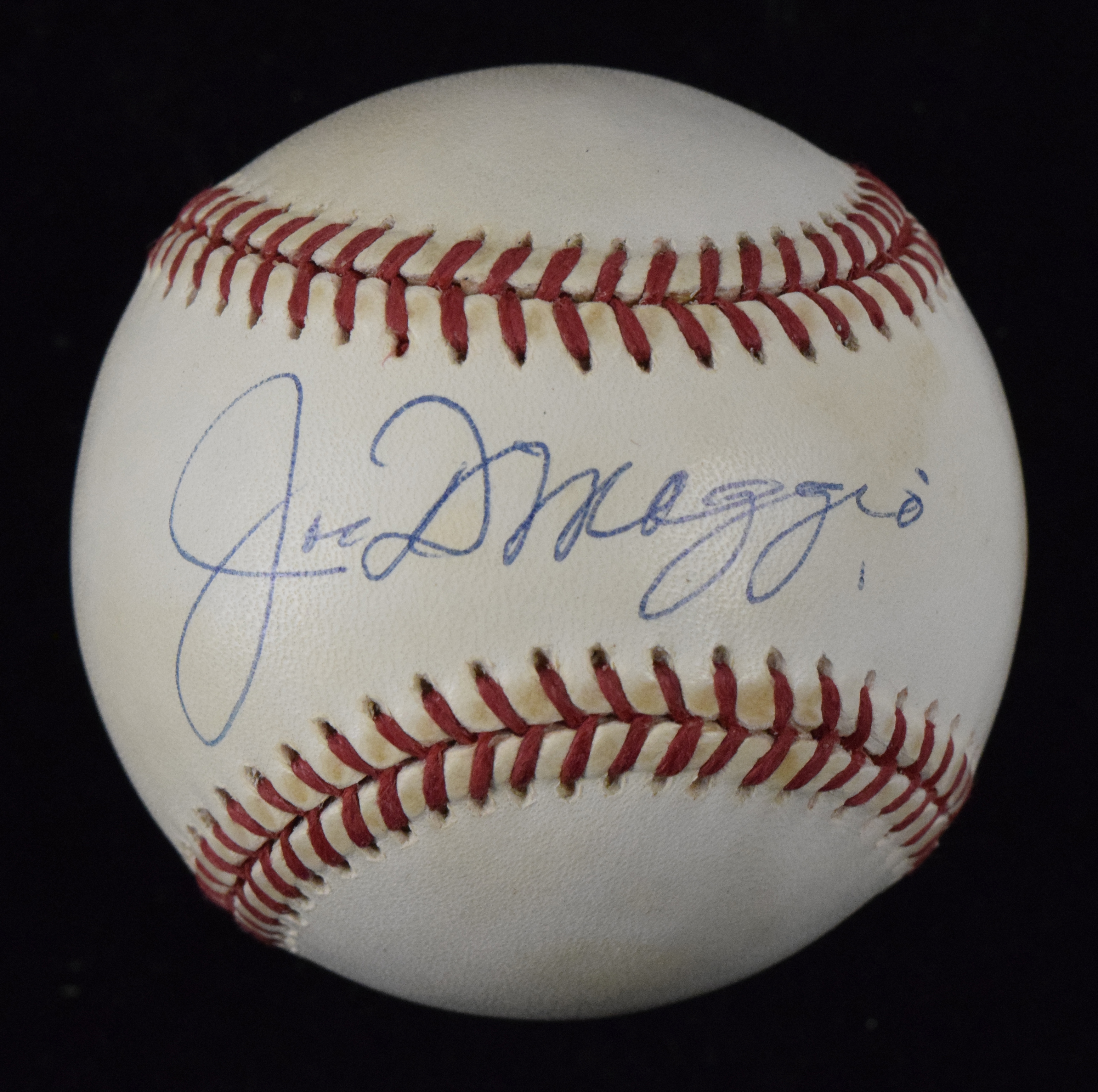 Description:Joe DiMaggio signed B.Brown AL baseball (EX). DiMaggio signed the sweet spot in blue ink. Signature rates 8/9 out of 10. Scattered areas of light to moderate toning: EX