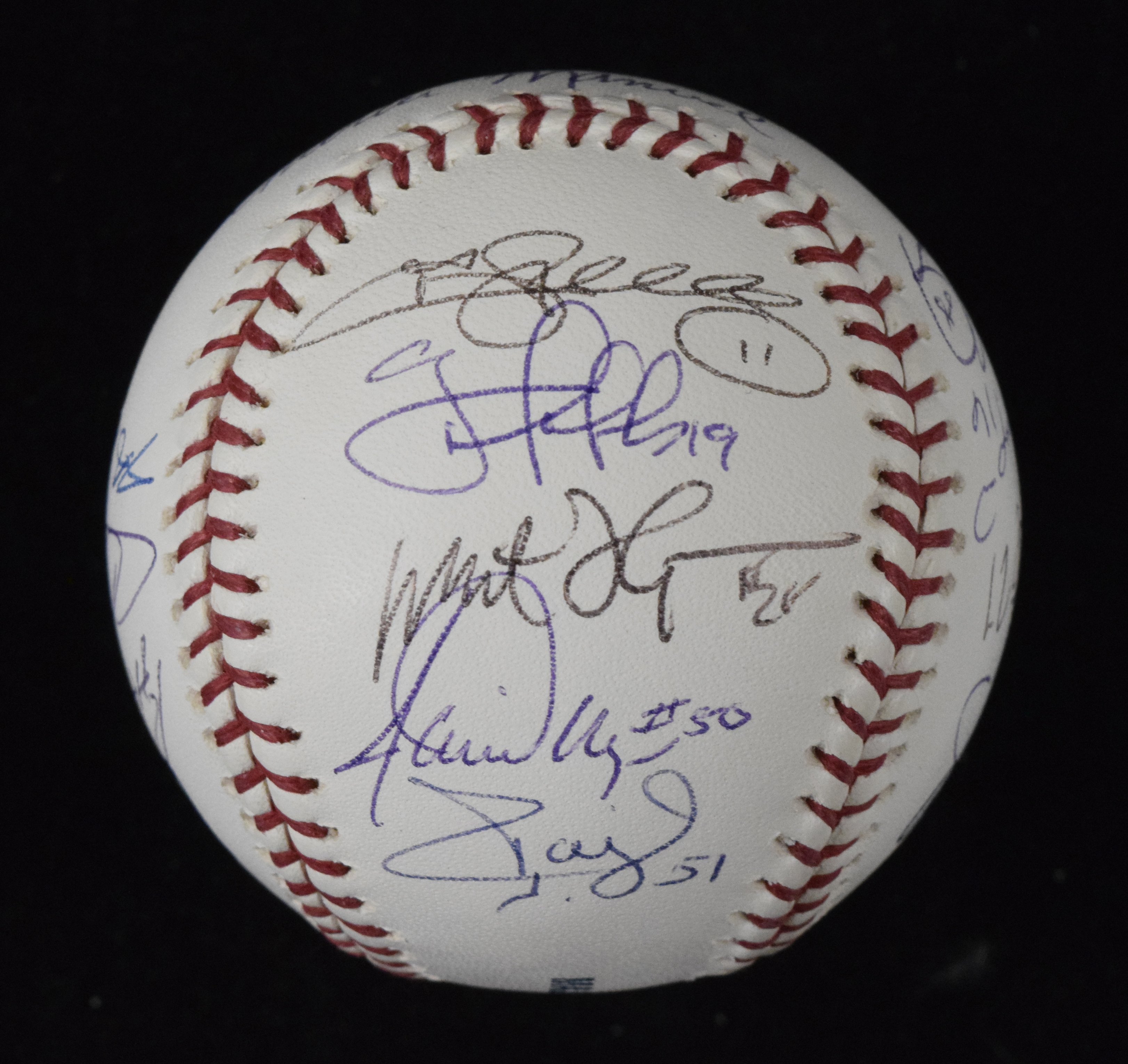 Description:2007 Philadelphia Phillies team signed baseball (NM). B.Selig ML ball signed by (17) members of the 2007 National League East champion Phillies including Charlie Manuel, Jimmy Rollins, Chase Utley, Ryan Howard, Aaron Rowand, Shane Victorino, Jayson Werth, Kyle Kendrick, Carlos Ruiz, J.C. Romero, Ryan Madson, Greg Dobbs, J.A. Happ, Chris Coste, Jamie Moyer, Tom Gordon, and Milt Thompson. Signatures rate 7/8 to 9/10 out of 10: NM