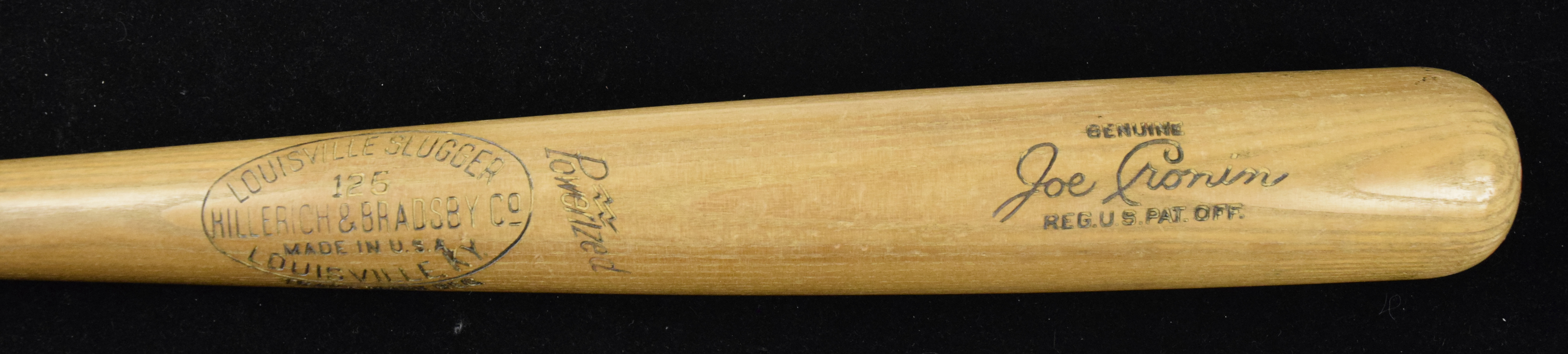 Description:Joe Cronin post career professional model baseball bat, c.mid-late 1940s (EX/MT). 35" Louisville Slugger C117 Joe Cronin model bat with "Trade Mark Reg." stamped under the label, and the model number stamped on the knob. Appears unused, with some minor surface wear: EX/MT