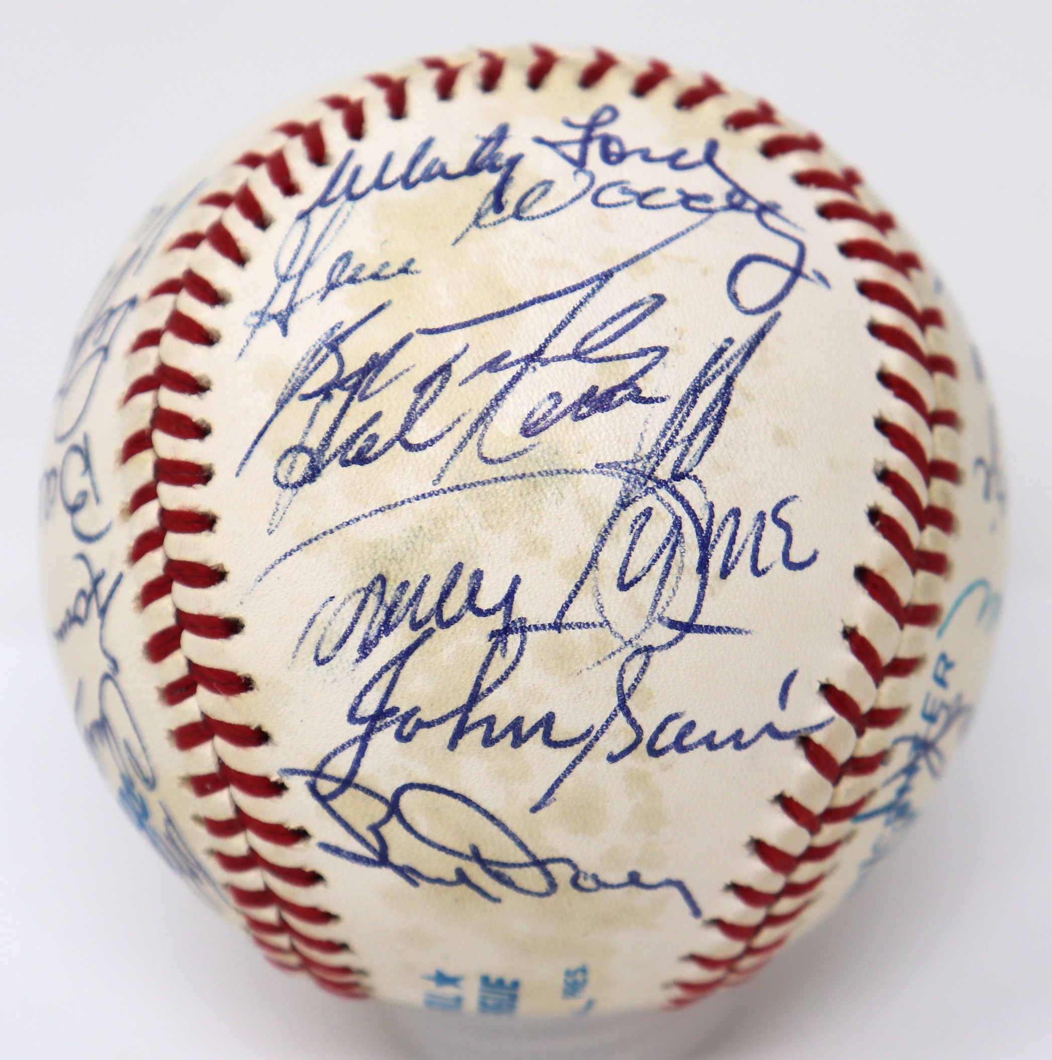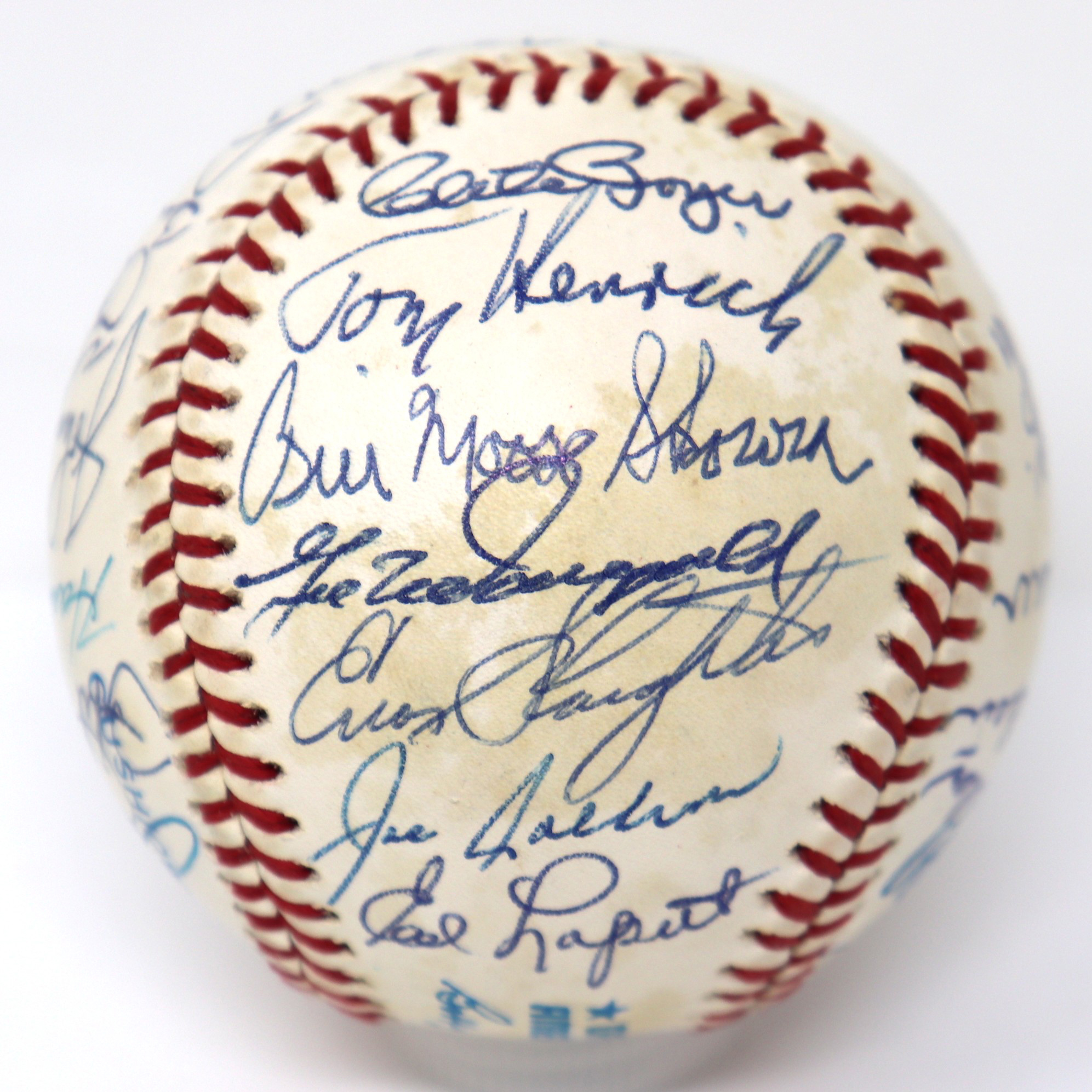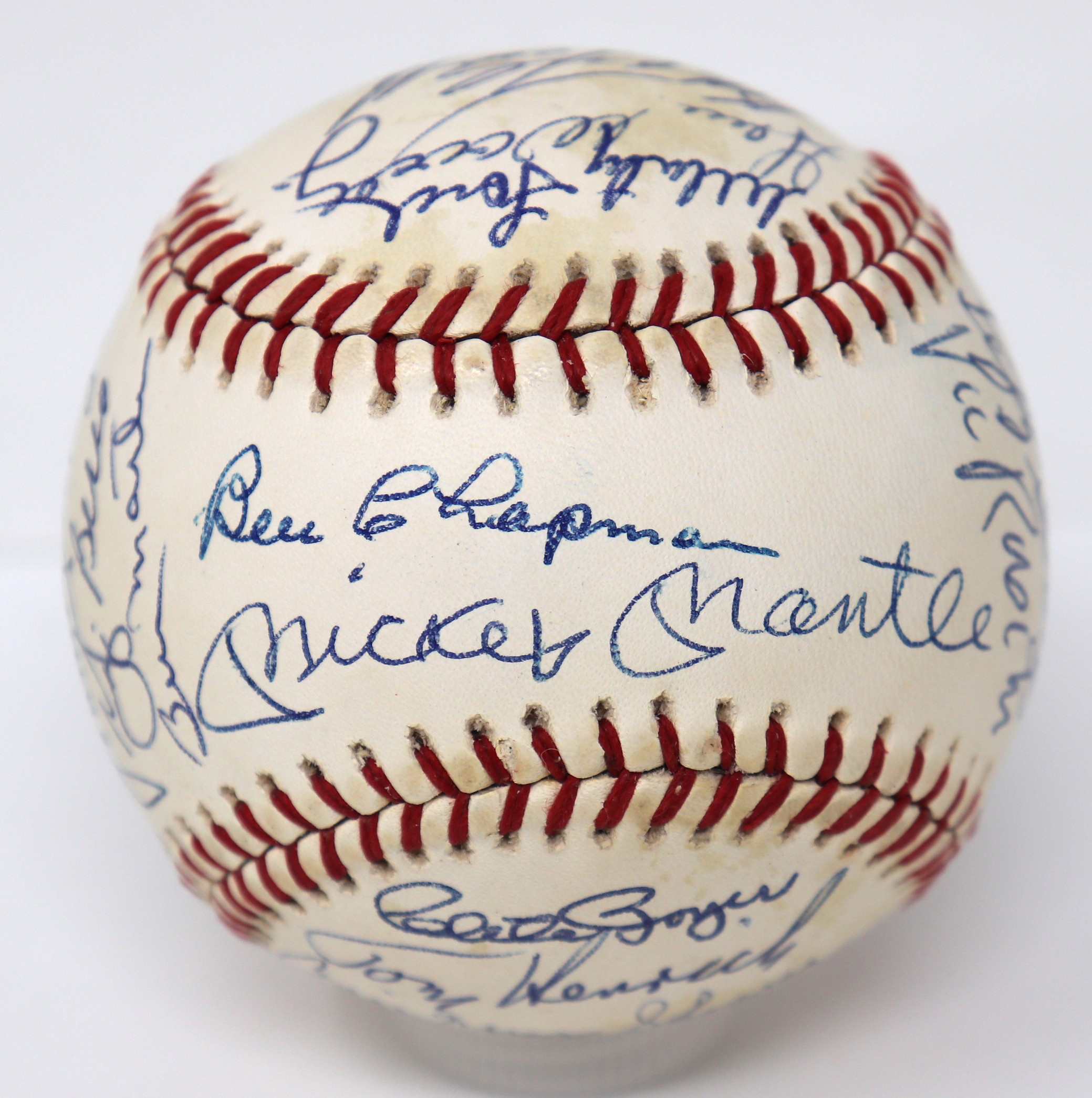 Description:New York Yankees old timers multi-signed baseball with (28) autographs including Mantle (EX-EX/MT). B.Brown American League ball signed by (28) including Mickey Mantle, Lefty Gomez, Yogi Berra, Johnny Mize, Phil Rizzuto, Whitey Ford, Enos Slaughter, Billy Martin, Ben Chapman, Vic Raschi, Johnny Sain, Charlie Keller, Bill "Moose" Skowron, Clete Boyer, Ed Lopat, Hank Bauer, Bobby Murcer, Tom Henrich, Tom Tresh, Gil McDougald, Bobby Shantz, Gene Woodling, Bob Turley, Hal Reniff, Tommy Byrne, Norm Siebern, Joe Collins, and Bud Daley. Signatures rate 7/8 to 9/10 out of 10 on average. Scattered areas of light toning: EX-EX/MT ($500-$750)