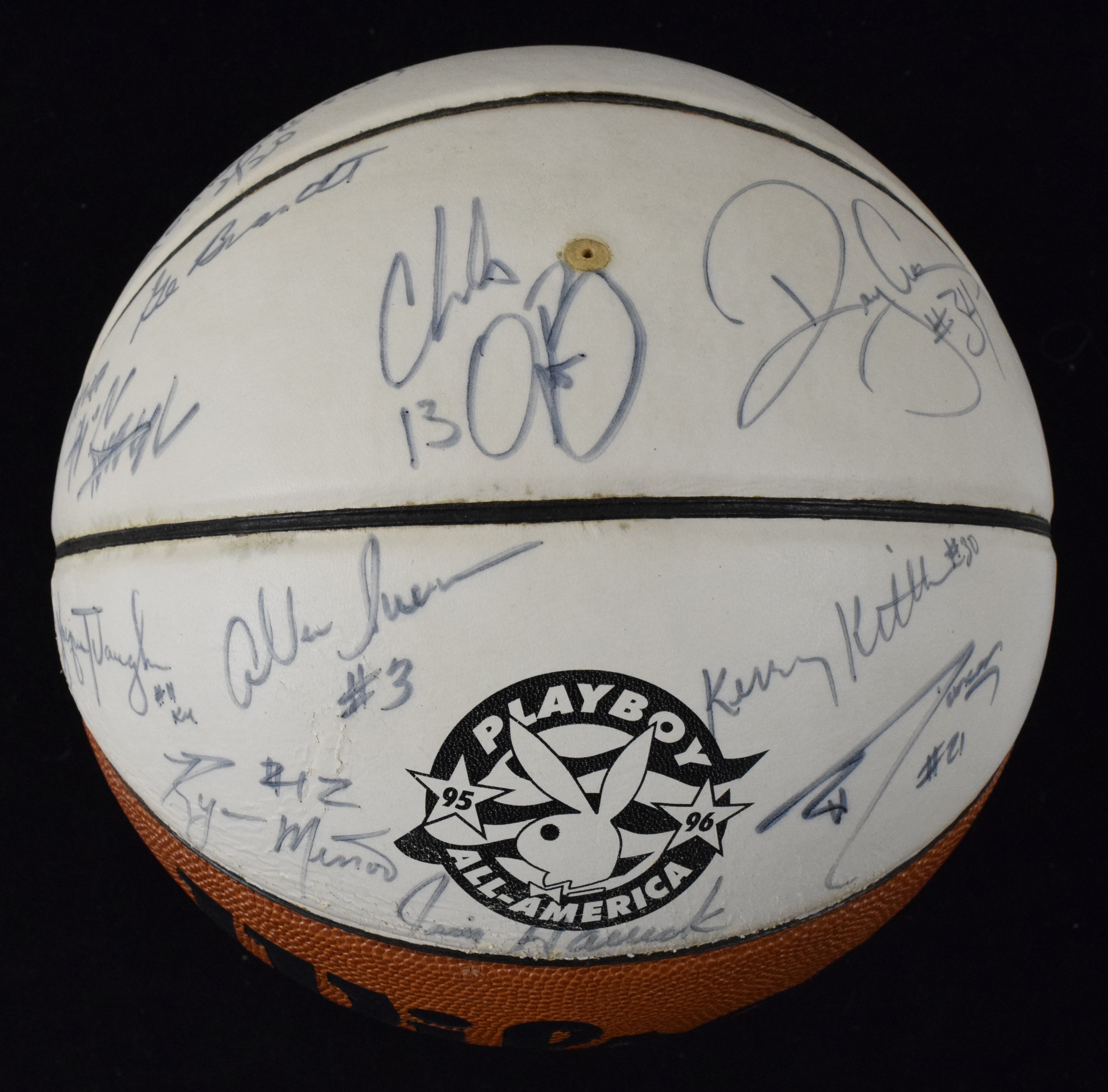 Description:1995-96 Playboy All-Americans team signed basketball (EX). Wilson white panel ball signed by (14) including Jim Harrick, Allen Iverson, Ray Allen, Tim Duncan, Marcus Camby with "#21 UMASS" inscription, Kerry Kittles, Keith Van Horn, Erick Dampier, Jacque Vaughn, Charles O'Bannon, Ryan Minor, Ronnie Henderson with "LSU" inscription, Gary Cole, and Gil Brandt. Signatures rate 7/8 to 9 out of 10. Areas of wear on the white surfaces mainly near the seams: EX
