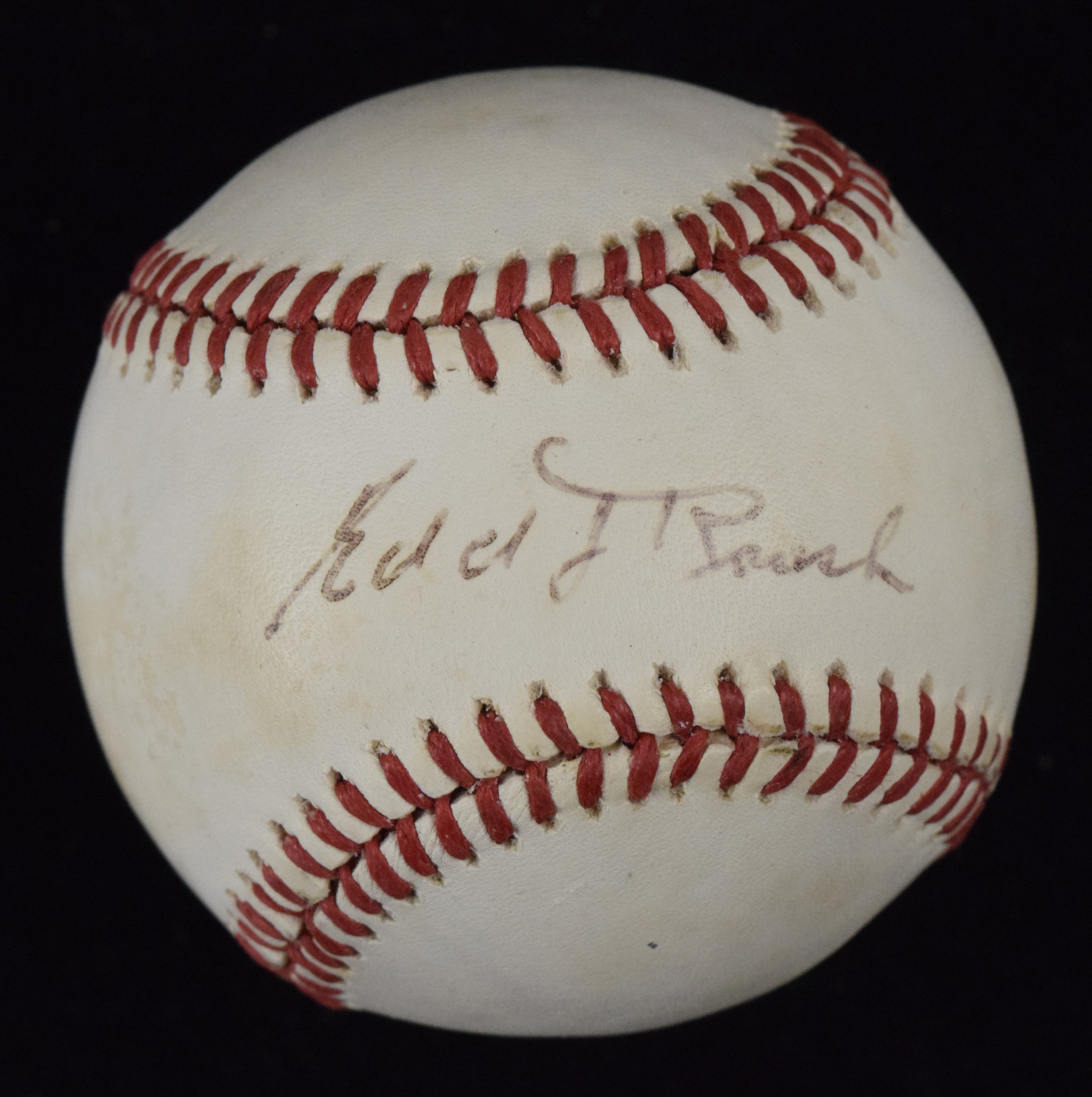 Description:Edd Roush signed B.Giamatti NL baseball - JSA (EX). Roush signed the sweet spot in black ink. Signature rates 7 out of 10. Includes LOA from JSA, with matching serial #ed sticker on the ball. Scattered areas of light to moderate toning: EX