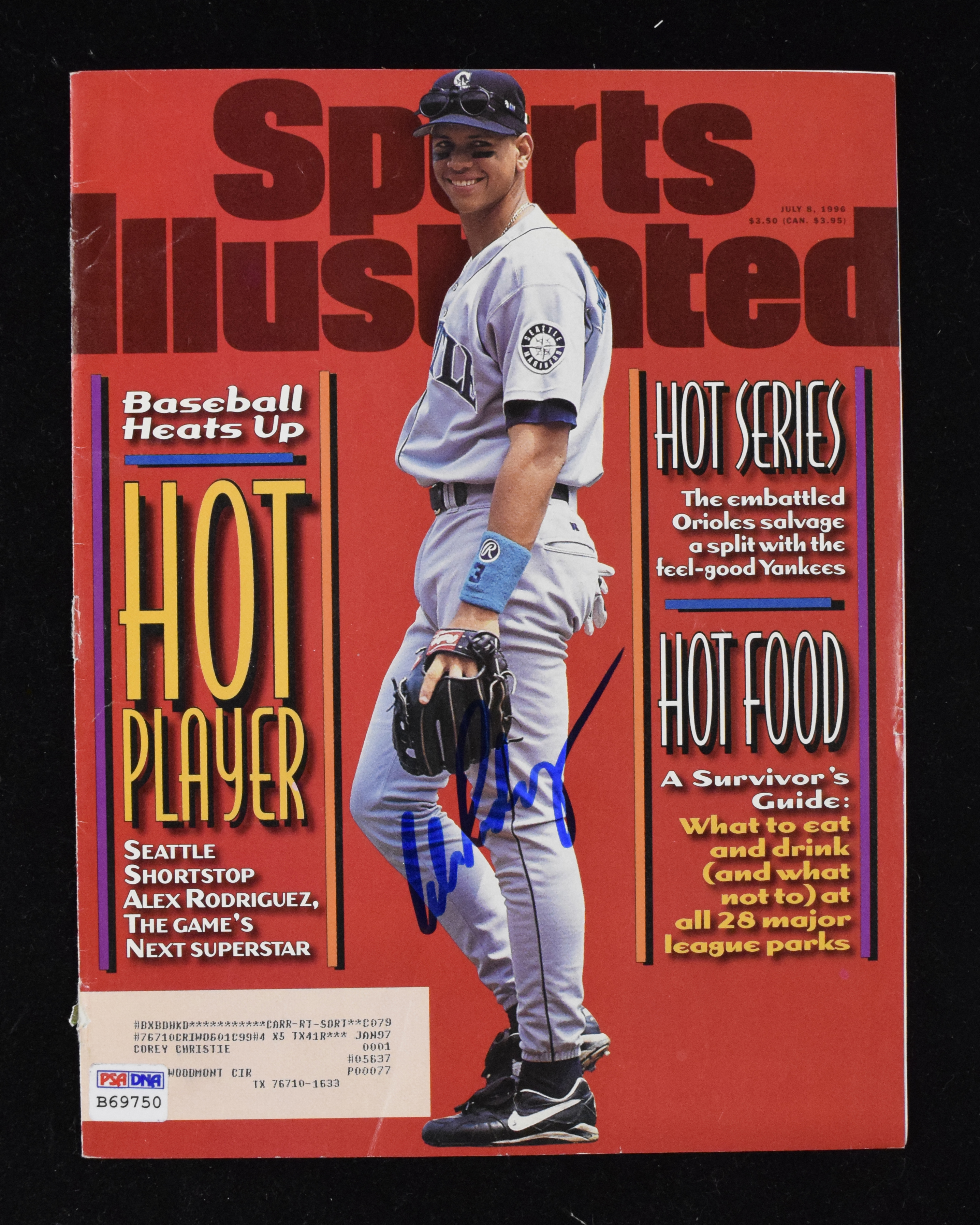 Description:Alex Rodriguez signed 1996 Sports Illustrated cover page - PSA/DNA (EX/MT). 7/8/1996 cover page signed by Rodriguez in blue marker. Signature rates 9/10 out of 10. PSA/DNA serial #ed sticker is affixed. Minor wear along the left edge: EX/MT