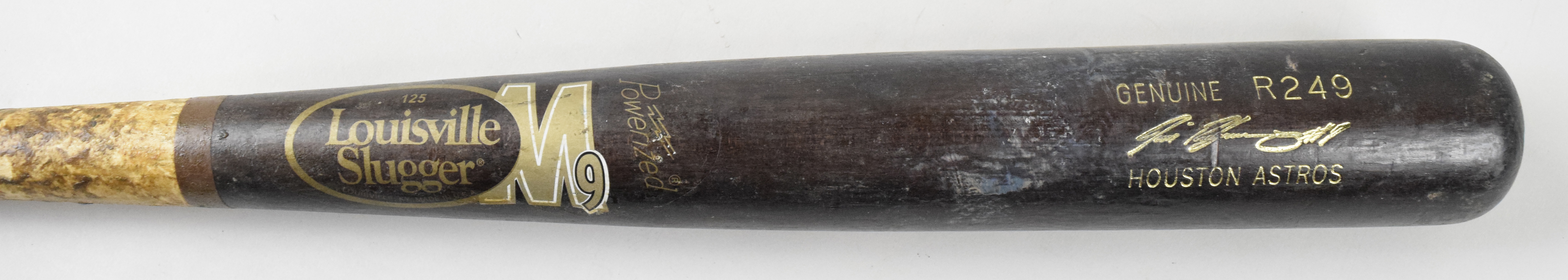 Description:2009 Ivan Rodriguez game used baseball bat (EX magnificent use). 34" Louisville Slugger R249 Ivan Rodriguez model bat with 5/8/2009 production date stamped on the knob and Houston Astros team on the barrel. #12 is written on the cupped end (wore for the Astros), and #7 is written on the knob above a blacked out #12. Massive use with ball marks, stitching impressions, spike marks, and heavy pine tar caked on the handle. Includes certificate of provenance from Rodriguez: EX
