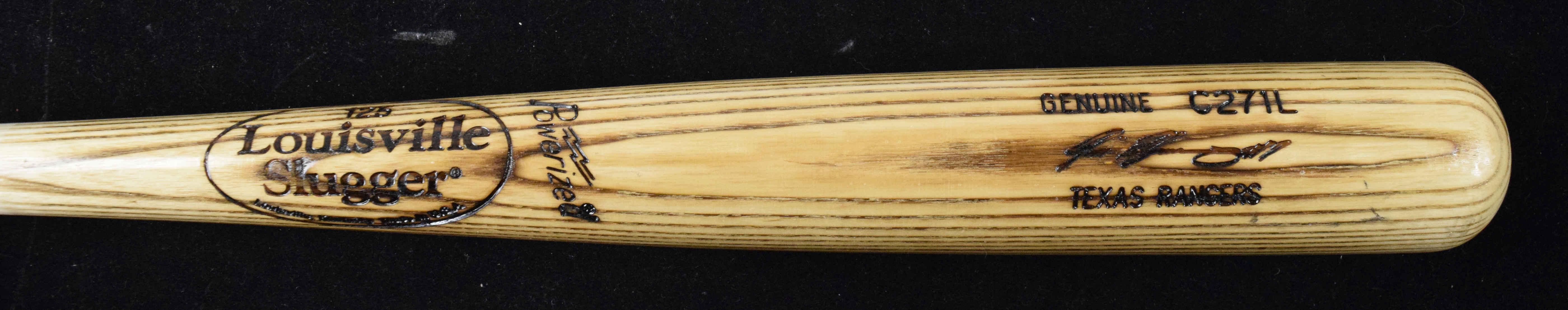 Description:Ivan Rodriguez professional model baseball bat, c.2009-10 (EX/MT-NM). 34" Louisville Slugger C271L Ivan Rodriguez model bat with 11/2/2009 production date and 34/33oz. stamped on the knob (Texas Rangers team on the barrel). Remains in unused condition. Includes certificate of provenance from Rodriguez: EX/MT-NM