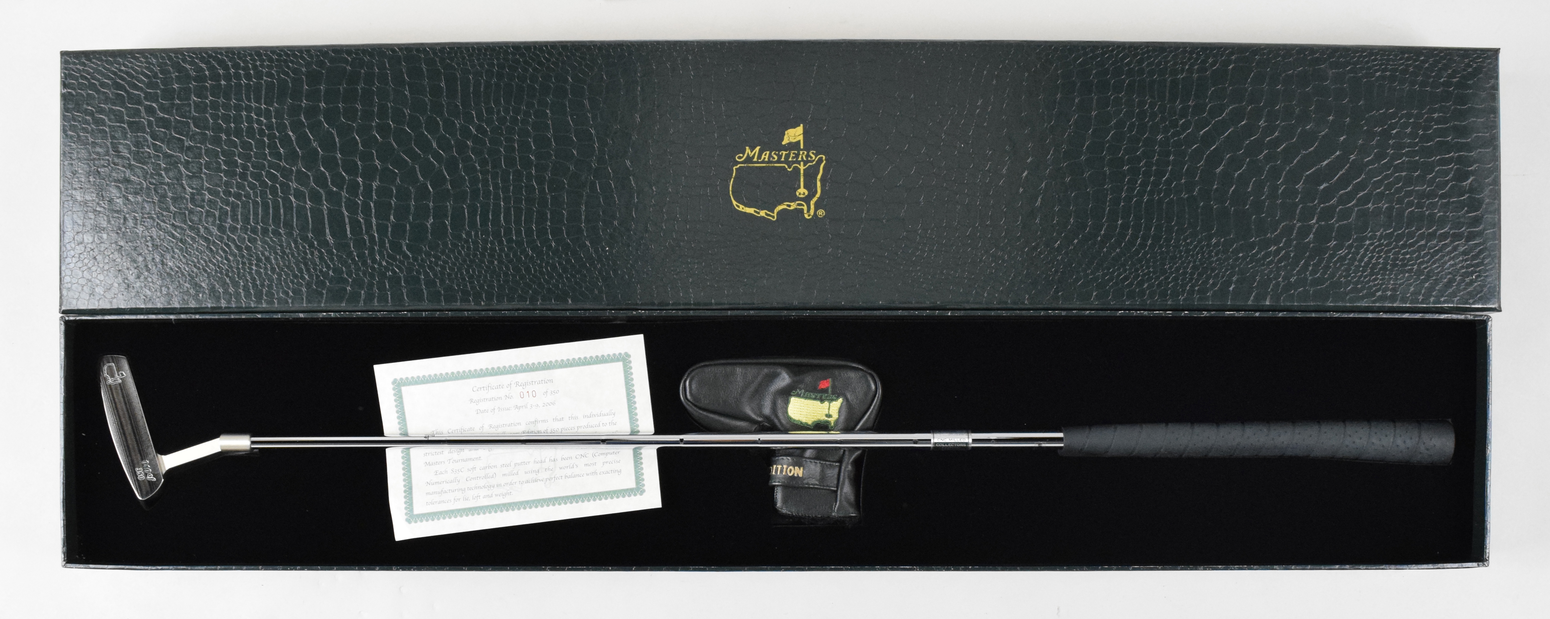Description:Limited edition Masters putter (NM/MT). Collectors edition produced exclusively for the 2006 Masters Tournament. Numbered 10/350. Includes certificate of registration, and leather head cover: NM/MT