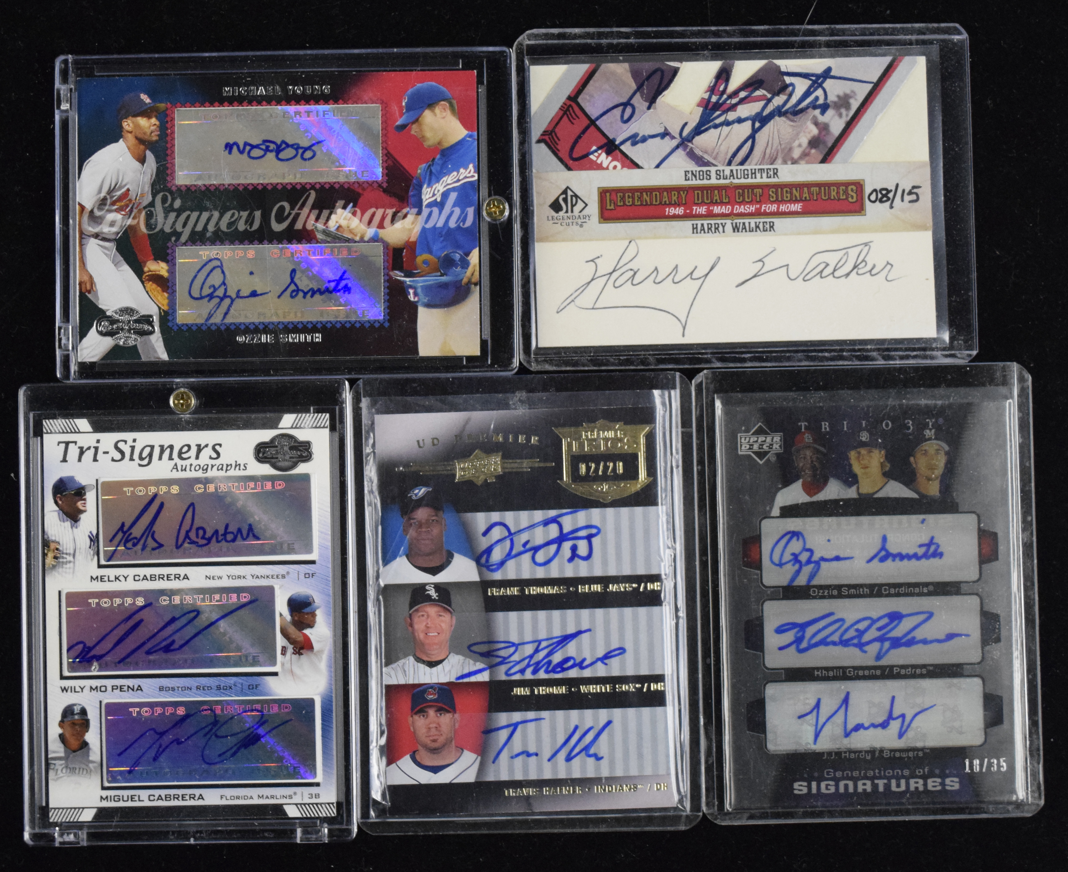 Description:Lot of (8) multi-signed baseball insert cards including stars and HOFers (NM-NM/MT). Includes 2005 Upper Deck Trilogy "Generations of Signatures Triple" #GENS-SGH multi-signed by Ozzie Smith, Khalil Greene, and J.J. Hardy (#ed 18/35); (2) 2006 Topps Co-Signers "Dual Autographs" #CS-83 both signed by Ozzie Smith and Michael Young; 2006 Upper Deck Exquisite Collection "Dual Rookie Signatures Gold" #10 signed by James Shields and by Jason Hammel (#ed 25/30); 2007 Topps Co-Signers "Tri-Signers" #TS-CPC multi-signed by Miguel Cabrera, Melky Cabrera, and Wily Mo Pena; 2008 Upper Deck Premier "Trios Autographs" #PTS-TTH multi-signed by Frank Thomas, Jim Thome, and Travis Hafner (#ed 2/20); 2009 Bowman Sterling "Dual Autographs" #DA-BPGA signed by Buster Posey and by Gordon Beckham; 2011 SP Legendary Cuts "Legendary Dual Cut Signatures" #DASH-SW signed by Enos Slaughter and by Harry Walker (#ed 8/15). Signatures rate 8/9 to 10 out of 10: NM-NM/MT