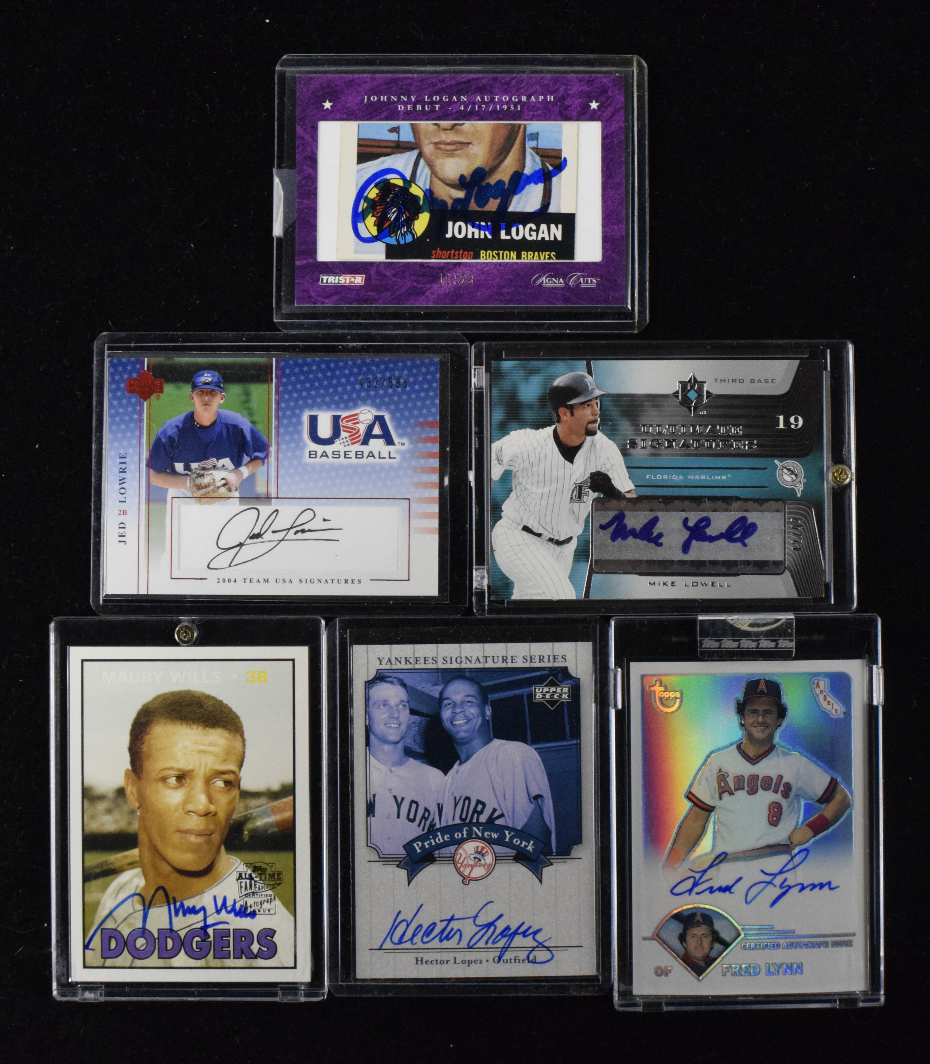 Description:Lot of (39) signed baseball rookie and insert cards (NM-NM/MT overall). Includes (2) Maury Wills, Johnny Logan, Hector Lopez, (3) Fred Lynn, (2) Davey Lopes, Ryan Zimmerman, David Wright, (2) Javy Lopez, Mark Loretta, (4) Mike Lowell, (4) Led Lowrie, Kevin Youkilis, Kyle Seager, Esteban Loaiza, (3) James Loney, Paul LoDuca, (3) Lance Lynn, Delmon Young, George Lombard, Felipe Lopez, (2) Donny Lucy, Tyler Lumsden, and Tyler Lyons. Signatures rate 7 to 10 (avg 9) out of 10: NM-NM/MT overall