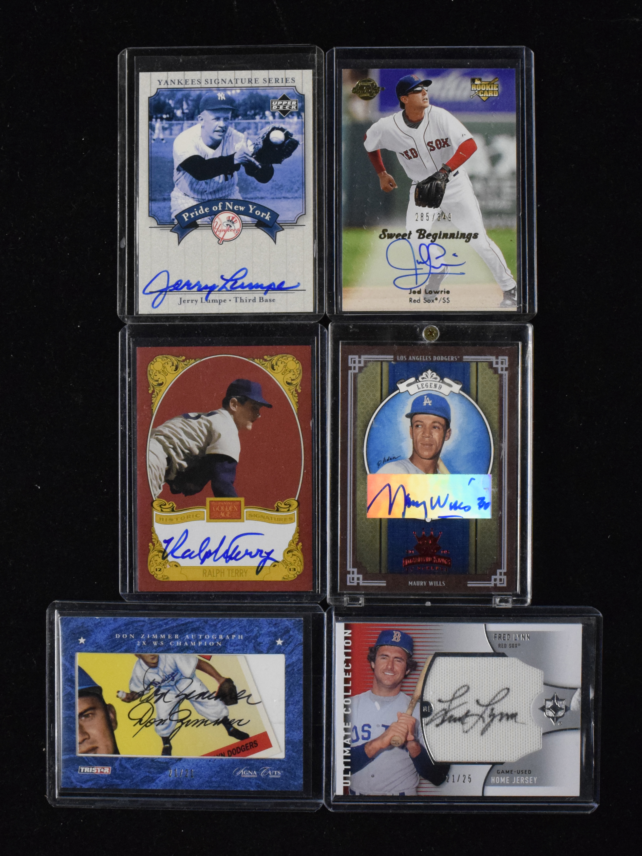 Description:Lot of (39) signed baseball rookie and insert cards (NM-NM/MT overall). Includes (2) Maury Wills, Ralph Terry, Don Zimmer, Jerry Lumpe, Don Lund, Hector Lopez, (2) Fred Lynn, Jim Lonborg, Davey Lopes, Kerry Wood, (3) Mike Lowell, (4) Jed Lowrie, Kevin Youkilis, (3) Javy Lopez, (4) Lance Lynn, Derek Lowe, (2) Paul LoDuca, (3) James Loney, Noah Syndergaard, Kyle Lobstein, Boone Logan, Felipe Lopez, and (2) Donny Lucy. Signatures rate 7 to 10 (avg 9) out of 10: NM-NM/MT overall