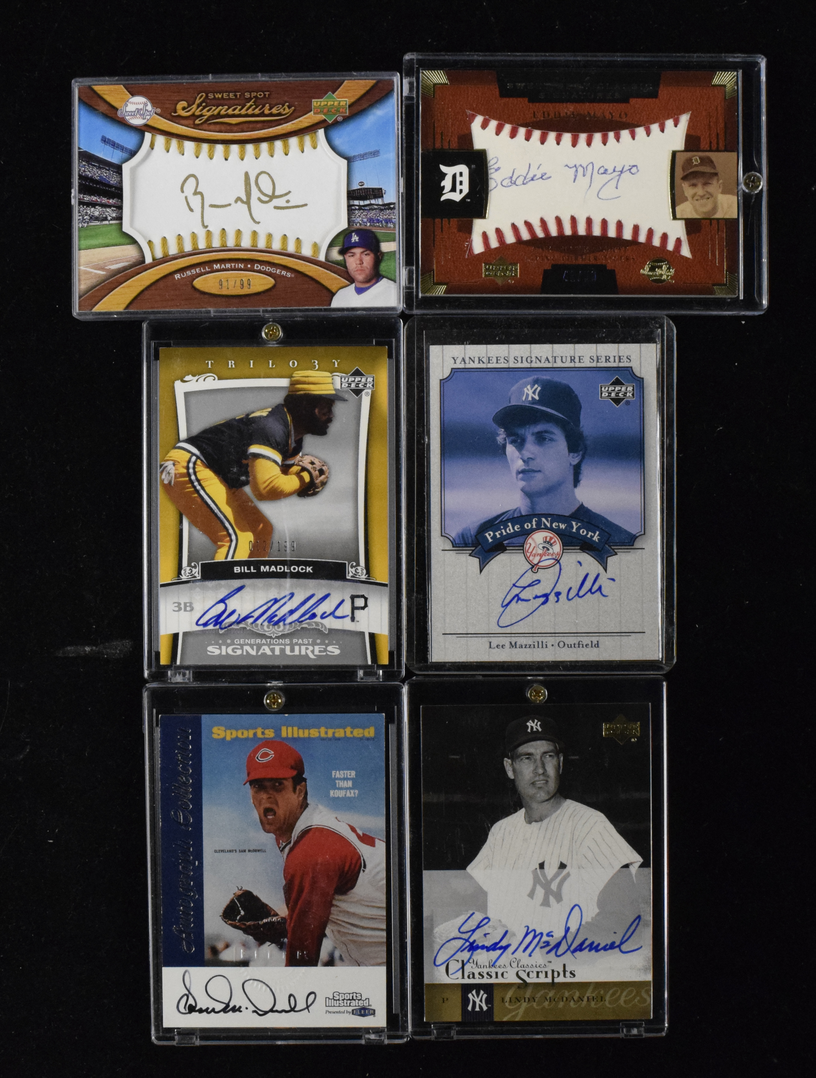 Description:Lot of (42) signed baseball rookie and insert cards (NM-NM/MT overall). Includes (4) Bill Madlock, Lindy McDaniel, Eddie Mayo, Sam McDowell, (2) Lee Mazzilli, Russell Martin, (2) Paul Maholm, Sean Marshall, Joe Mays, Jim Mason, (2) Cameron Maybin, John Mayberry Jr, (7) Ruben Mateo, Luis Matos, Val Majewski, (2) Andy Marte, Lou Marson, (2) Jake Mauer, Macay McBride, (3) Nick Maronde, Jacob May, Jarod McAuliff, Alejandro Machado, Matt Macri, Eddy Martinez, and Shairon Martis. Signatures rate 7 to 10 (avg 9) out of 10: NM-NM/MT overall