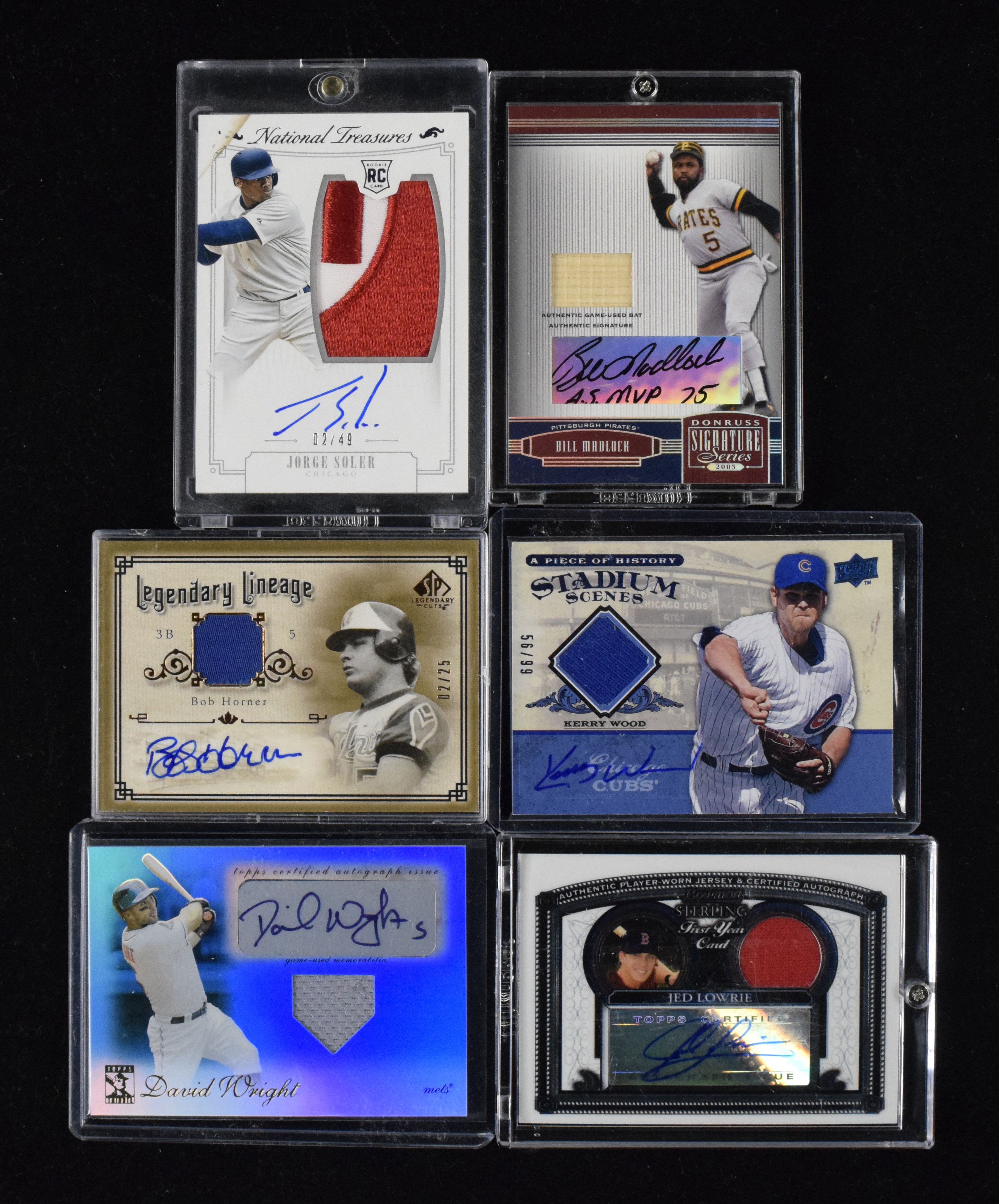 Description:lot of (26) signed bseball game used relic insert cards (NM-NM/MT overall). Includes (2) Bill Madlock, Kerry Wood, David Wright, Bob Horner, (5) Jorge Soler, (2) Jed Lowrie, James Loney, Paul LoDuca, Johnny Estrada, Orlando Cabrera, Jeremy Bonderman, Lance Lynn, Cameron Maybin, Tom Gorzelanny, Daniel McCutchen, (3) Anderson Machado, Bobby Livingston, and Yangervis Solarte. Signatures rate 8 to 10 out of 10: NM-NM/MT overall