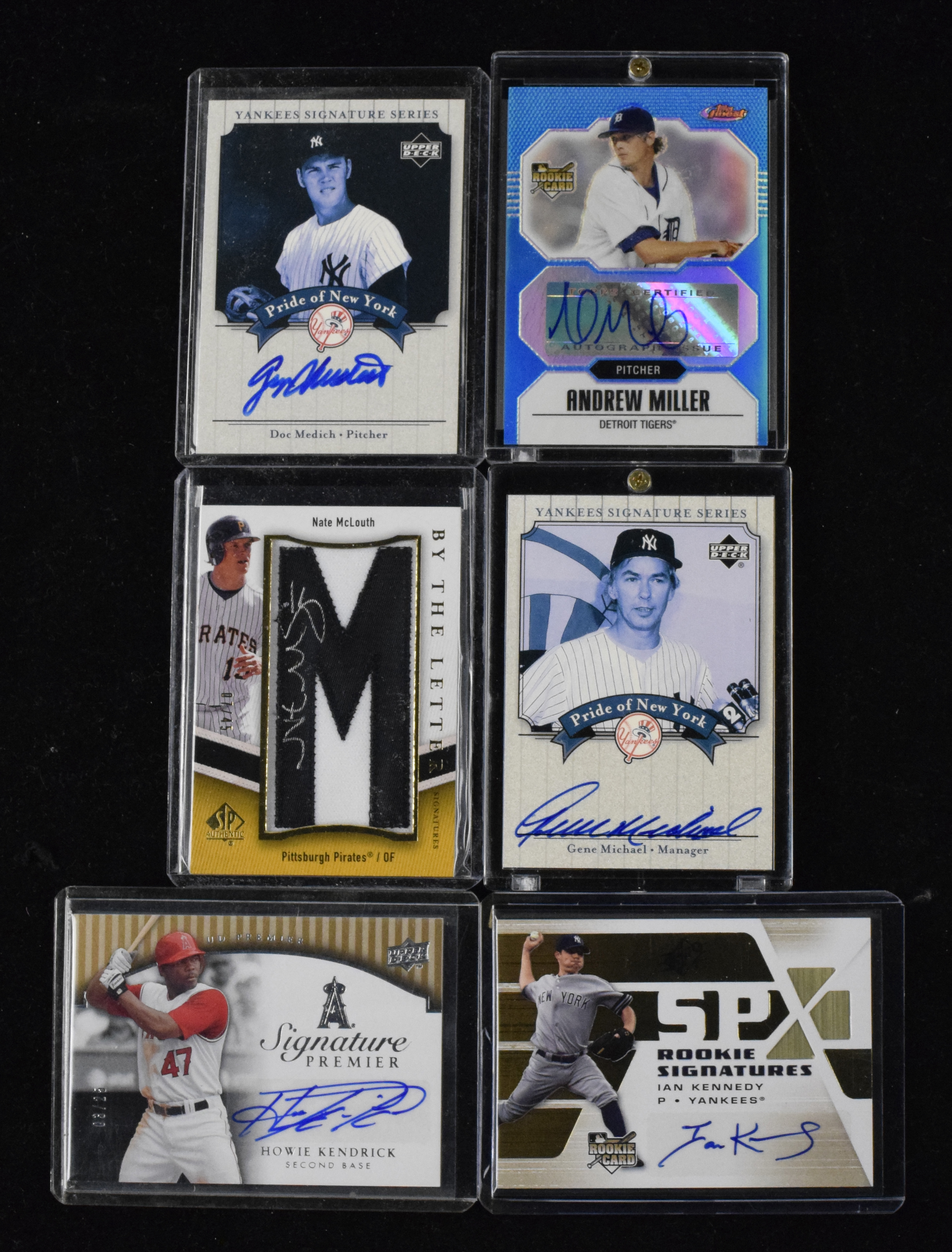 Description:Lot of (43) signed baseball rookie and insert cards (NM-NM/MT overall). Includes Gene Michael, Doc Medich, (4) Howie Kendrick, (3) Austin Kearns, Nate McLouth, (3) Andrew Miller, Adam Kennedy, (2) Ian Kennedy, (3) Devin Mesoraco, Bobby Kielty, (2) Tommy Milone, (2) Wade Miley, Doug Mientkiewicz, (4) Dallas McPherson, Shelby Miller, Kyle Kendrick, Joe Kennedy, Brad Miller, Daniel McCutchen, (3) Lastings Milledge, Bobby Keppel, (2) Colby Miller, Bradley McCann, and (2) Ryan Meaux. Signatures rate 7 to 10 (avg 9) out of 10: NM-NM/MT overall