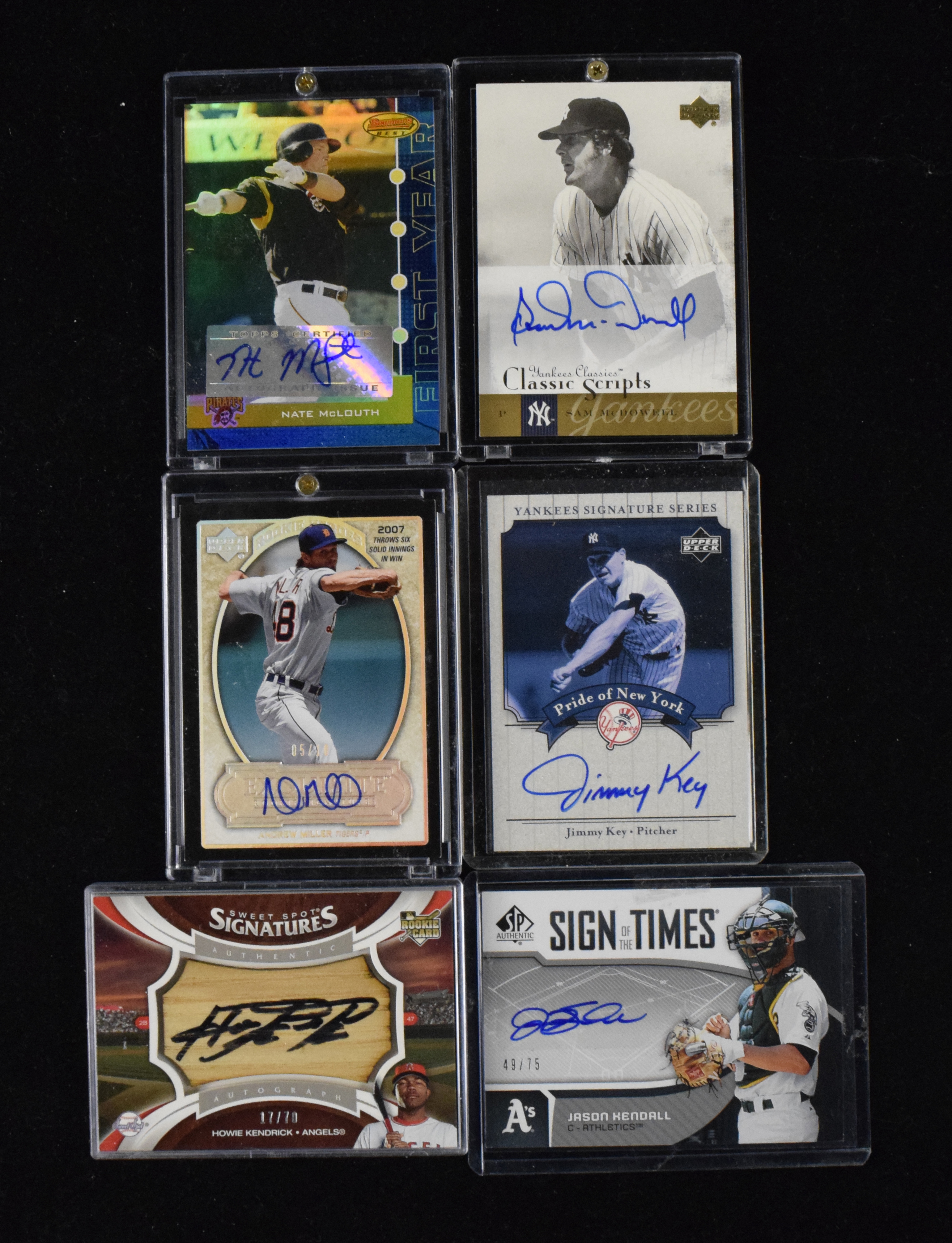 Description:Lot of (43) signed baseball rookie and insert cards (NM-NM/MT overall). Includes Jimmy Key, Sam McDowell, (3) Andrew Miller, (2) Nate McLouth, (4) Howie Kendrick, Jason Kendall, (2) Ian Kennedy, (3) Austin Kearns, (3) Devin Mesoraco, (2) Tommy Milone, Shelby Miller, (2) Wade Miley, Adam Kennedy, Brad Miller, (2) Lastings Milledge, (3) Dallas McPherson, Daniel McCutchen, Steve Kent, Joe Kennedy, Justin Miller, Eddy Martinez, Jackson Melian, (3) Ryan Meaux, and (2) Colby Miller. Signatures rate 7 to 10 (avg 9) out of 10: NM-NM/MT overall
