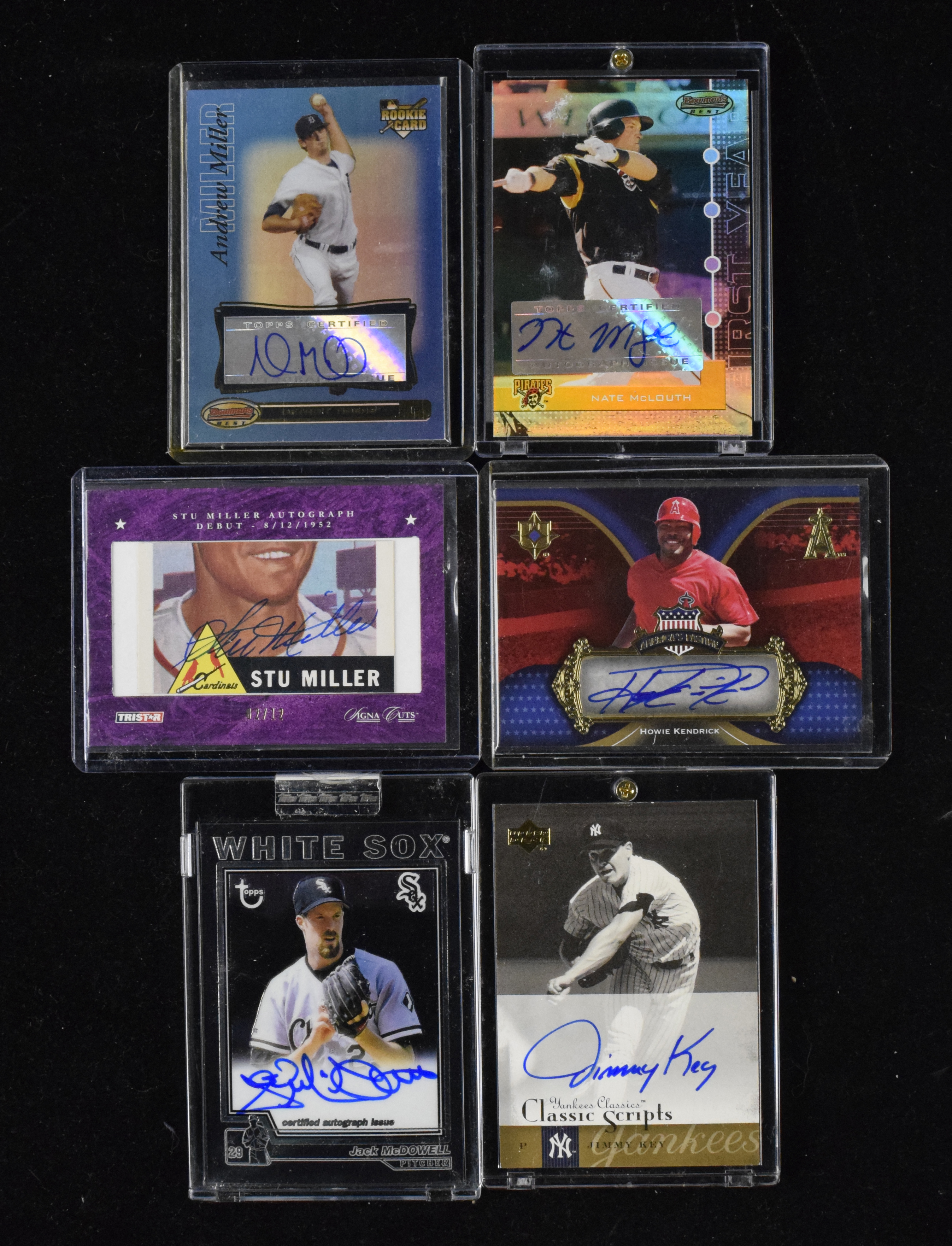 Description:Lot of (43) signed baseball rookie and insert cards (NM-NM/MT overall). Includes Stu Miller, Jimmy Key, Jack McDowell, (3) Andrew Miller, (4) Howie Kendrick, Nate McLouth, Doc Medich, (2) Ian Kennedy, Shelby Miller, (3) Austin Kearns, (3) Devin Mesoraco, (2) Wade Miley, Tom Milone, Kyle Kendrick, (5) Dallas McPherson, (3) Lastings Milledge, Adam Miller, (2) Joe Kennedy, Don Kelly, (2) Colby Miller, Ryan McCarthy, and (3) Ryan Meaux. Signatures rate 7 to 10 (avg 9) out of 10: NM-NM/MT overall