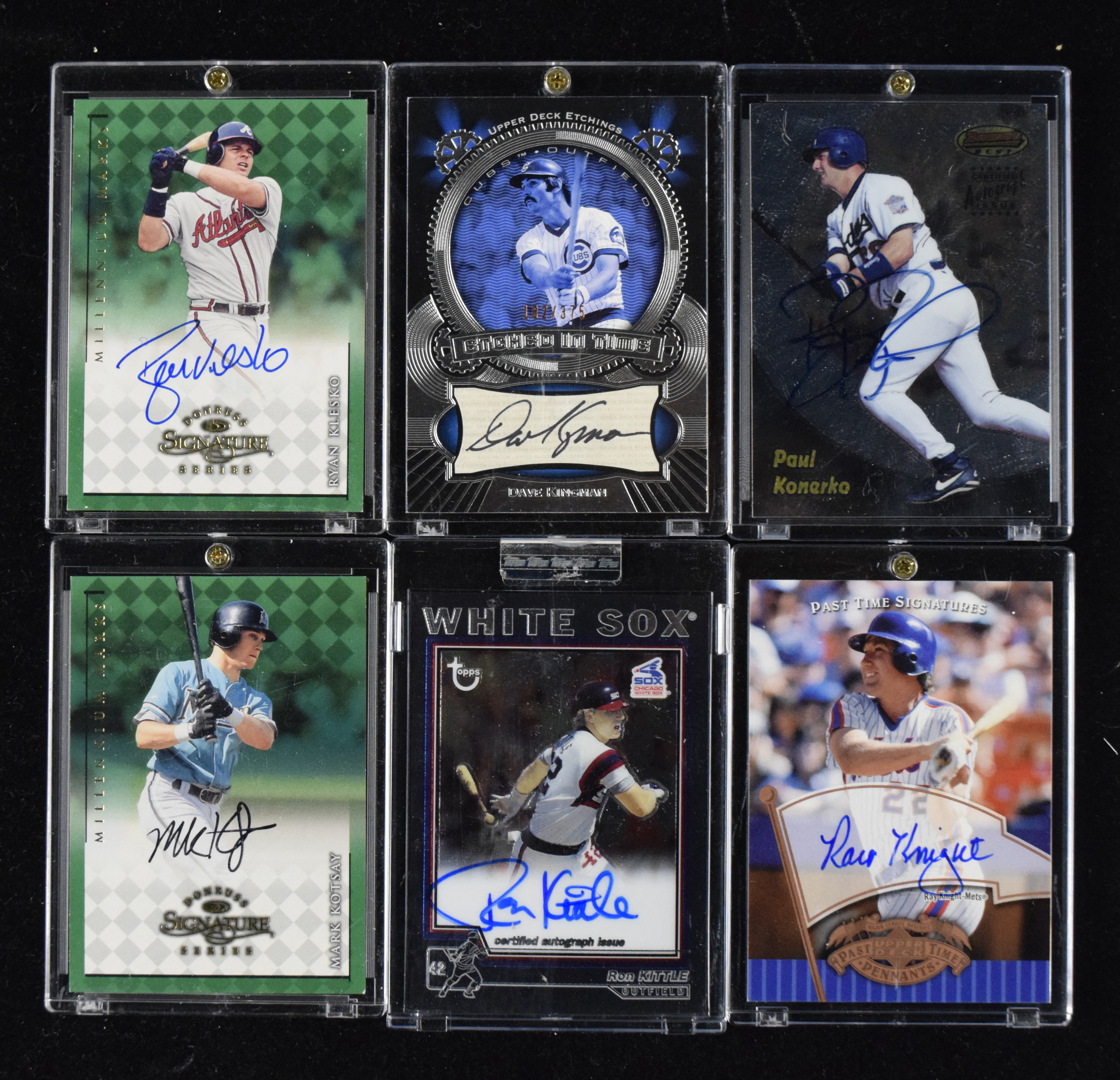 Description:Lot of (44) signed baseball rookie and insert cards (NM-NM/MT overall). Includes (4) Paul Konerko, (4) Dave Kingman, Ron Kittle, (2) Ryan Klesko, (4) Corey Knebel, Ray Knight, Scott Kazmir, (2) Mark Kotsay, Chuck Knoblauch, (17) Casey Kotchman, Mike Kinkade, Justin Knoedler, Graham Koonce, (2) George Kottaras, John Koronka, and Joseph Koshansky. Signatures rate 7 to 10 (avg 9) out of 10: NM-NM/MT overall
