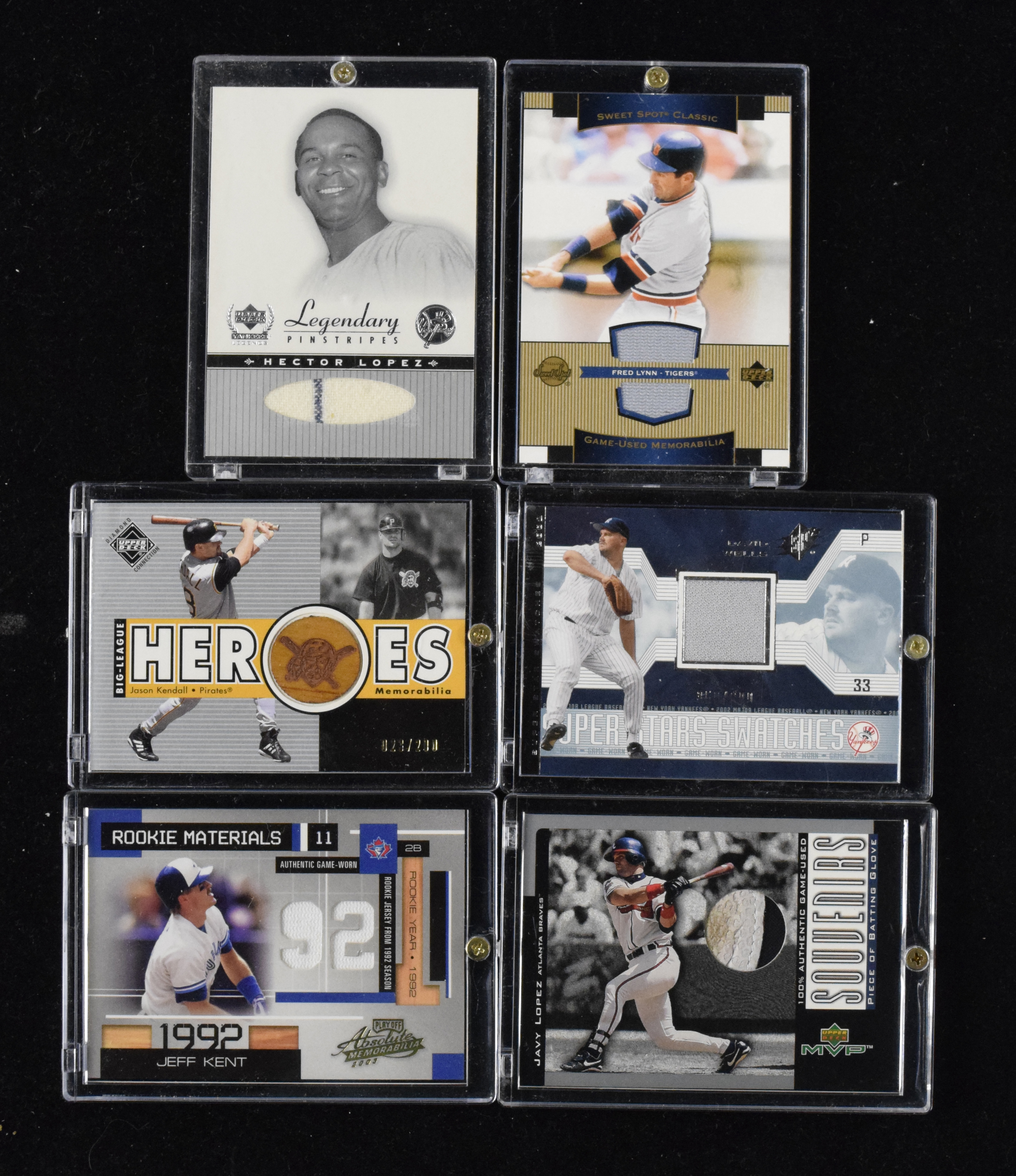 Description:Lot of (52) baseball game used relic swatch insert cards (NM-NM/MT overall). Includes (9) Jeff Kent, Fred Lynn, (2) Hector Lopez, Mike Lowell, Chuck Knoblauch, Howie Kendrick, David Wells, (5) Jason Kendall, Derek Lowe, (3) Javy Lopez, (2) Corey Knebel, Ryan Klesko, (2) Jason Kubel, (5) Austin Kearns, (3) Doug Mientkiewicz, Cameron Maybin, (2) Kaz Matsui, Joe Mays, (2) Byung-Hyun Kim, Mike Lamb, Brad Miller, (2) Ruben Mateo, Joe Kennedy, dual-relics card of Willie Randolph / Chuck Knoblauch, dual-relics card of Dwight Gooden / David Wells, and dual-relics card of Sean Burroughs / Ryan Klesko: NM-NM/MT overall