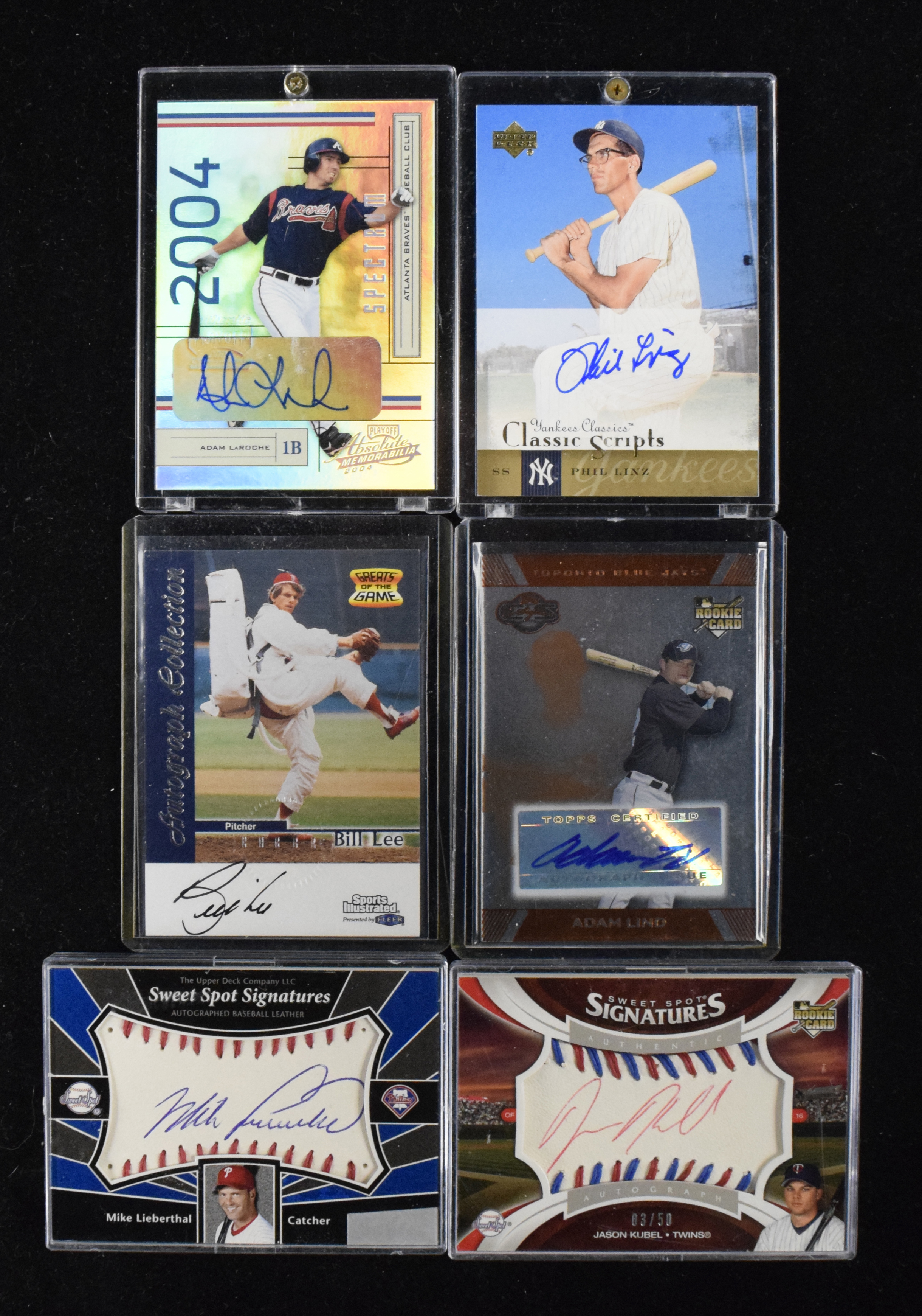 Description:Lot of (35) signed baseball rookie and insert cards (NM-NM/MT overall). Includes Phil Linz, Bill Lee, Mike Lieberthal, (6) Adam Lind, (4) Jason Kubel, (4) Adam LaRoche, (2) Mike Leake, (5) Fred Lewis, (3) Andy LaRoche, Mike Lamb, Jason Lane, Aaron Laffey, Andrew Kown, Todd Linden, William Layman, Duron Legrande, and Scott Lewis. Signatures rate 7 to 10 (avg 9) out of 10: NM-NM/MT overall