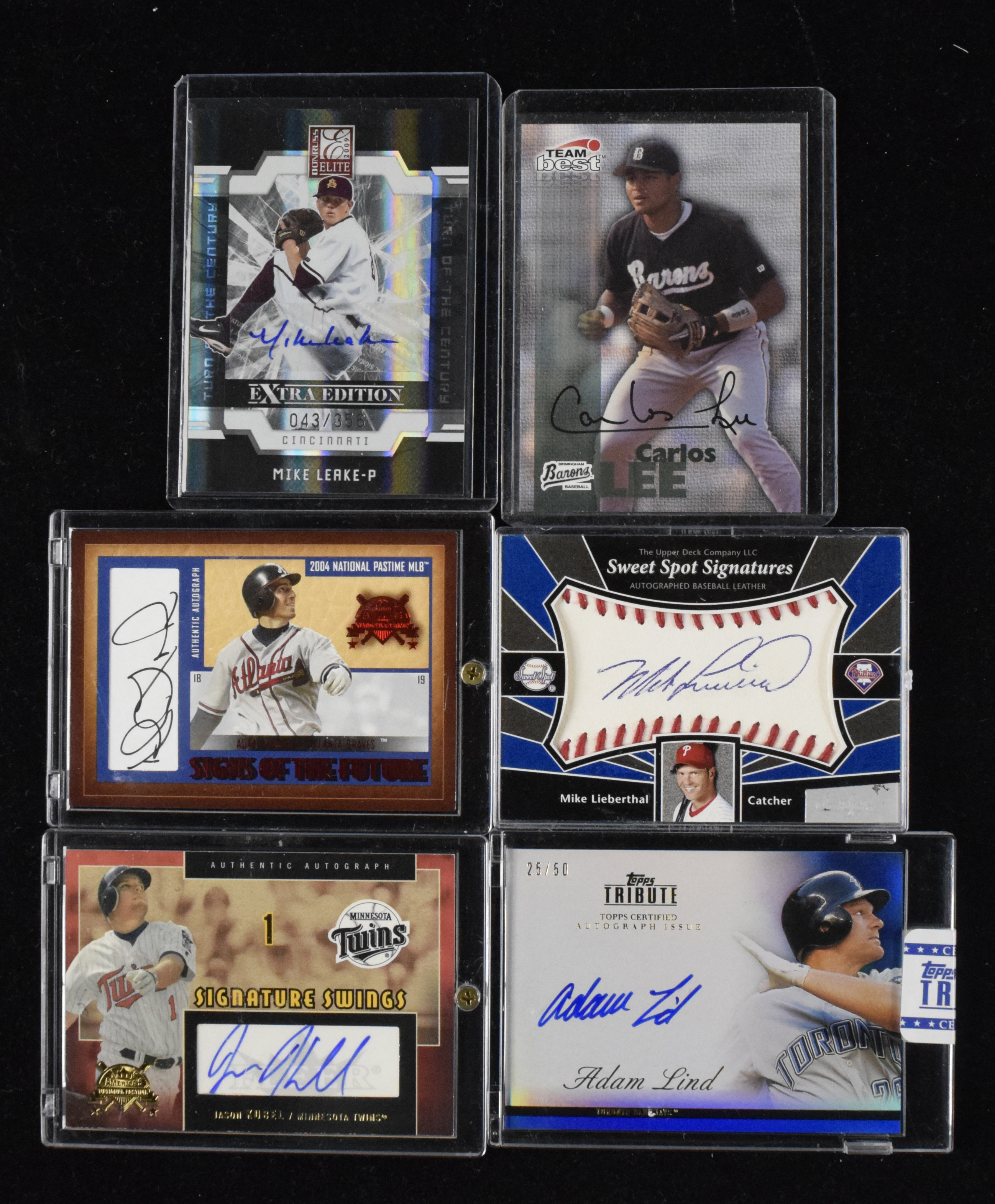 Description:Lot of (35) signed baseball rookie and insert cards (NM-NM/MT overall). Includes Mike Lieberthal, Carlos Lee, (2) Adam LaRoche, (2) Mike Leake, (6) Adam Lind, (4) Jason Kubel, Brett Lawrie, (5) Fred Lewis, Jason Lane, (2) Mike Lamb, (4) Andy LaRoche, Cole Liniak, Chris Lambert, Joshua LeBlanc, Wesley Letson, Ryan Lipkin, and Todd Linden. Signatures rate 7 to 10 (avg 9) out of 10: NM-NM/MT overall