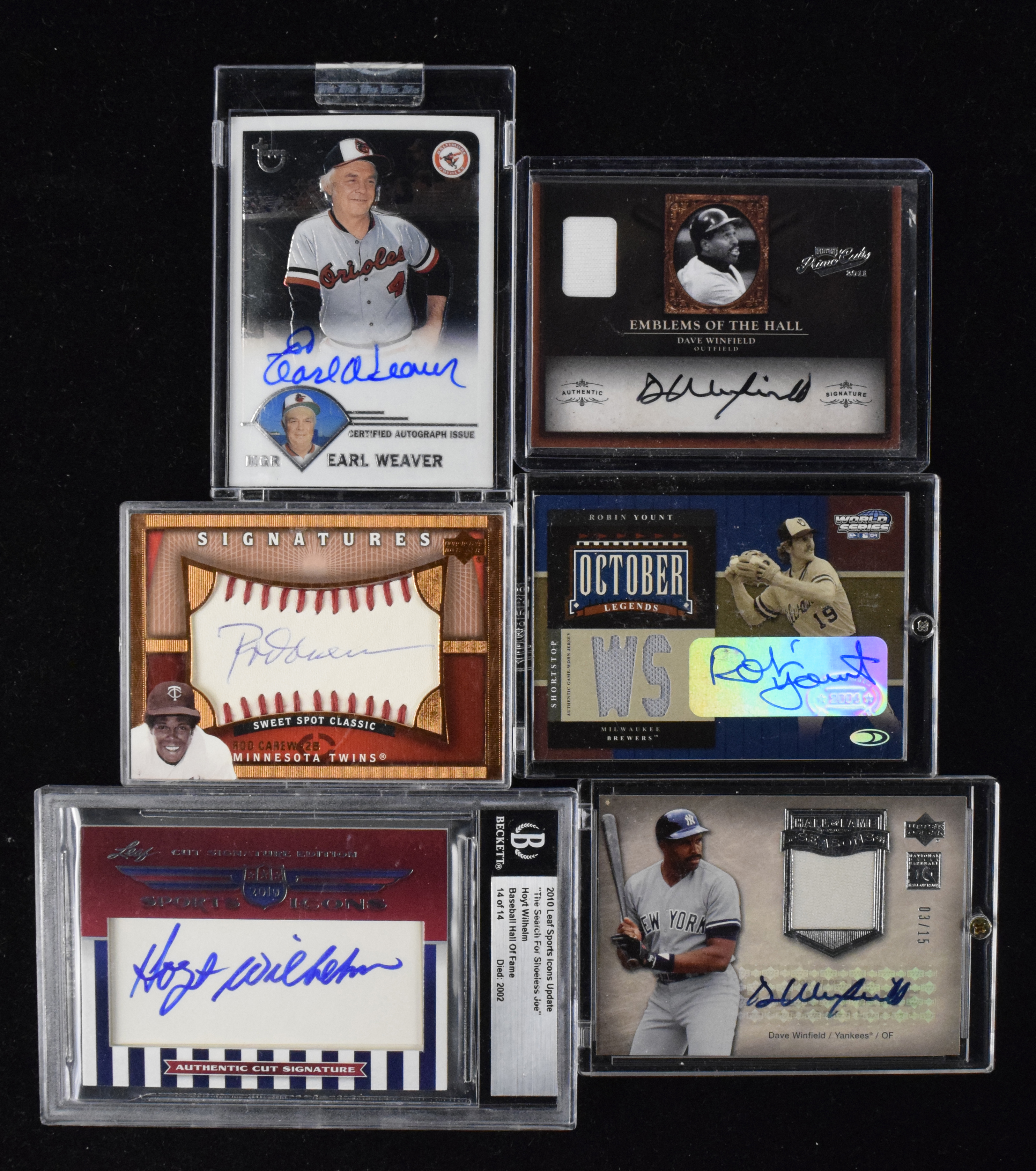Description:Lot of (7) Baseball HOFers signed insert cards (NM-NM/MT overall). Includes 1999 Sports Illustrated Greats Of The Game "Autographs" signed by Earl Weaver, 2003 Topps Retired Signature Edition "Autographs" #TA-EW signed by Earl Weaver, 2004 Donruss World Series "October Legends Signature Material" #OL-16 signed by Robin Yount (#ed 16/25), 2005 Upper Deck Sweet Spot Classic "Signatures" #CA signed by Rod Carew, 2005 Upper Deck Hall Of Fame "Seasons Autograph-Material Silver" #HFS-DW1 signed by Dave Winfield (#ed 3/15), 2010 Leaf Sports Icons Update "Cut Signature Edition" signed by Hoyt Wilhelm (#ed 14 of 14), and 2011 Panini Prime Cuts "Emblems of the Hall Materials Signatures" #19 signed by Dave Winfield (#ed 18/25). Signatures rate 8 to 10 out of 10: NM-NM/MT overall