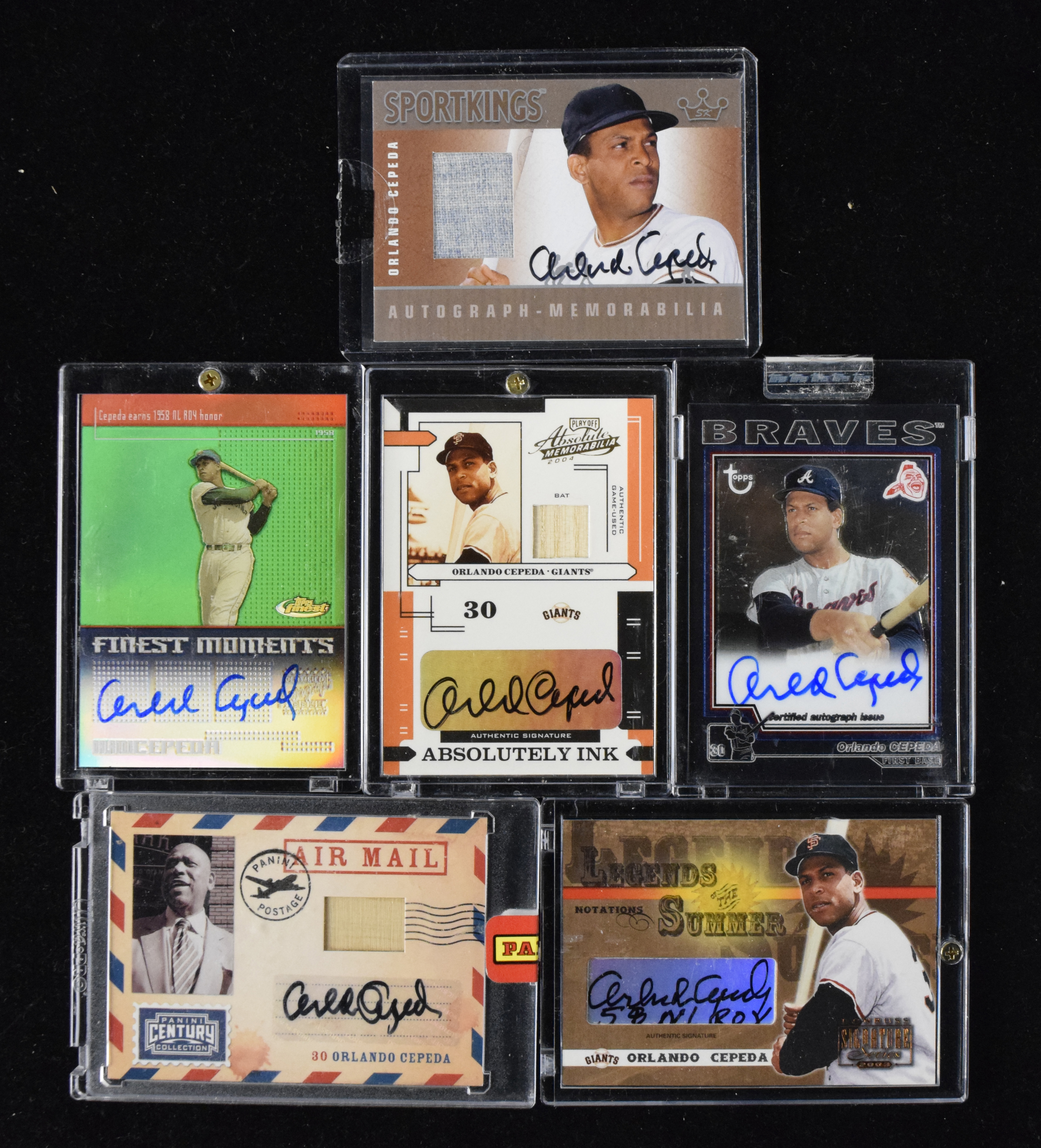 Description:Lot of (8) Orlando Cepeda signed insert cards including serial numbered & relics (NM-NM/MT). Includes 2003 Topps Finest "Moments Refractors Autographs" #FMA-OC signed by Cepeda, 2003 Donruss Signature Series "Legends of Summer Autographs Notations: #LS-35 signed by Cepeda with "58 NL ROY" inscription (#ed 29/40), 2003 Upper Deck Sweet Spot Classic "Autographs Blue Ink" #CG-OC signed by Cepeda, 2004 Topps Finest "Moments Autographs" #FMA-OC signed by Cepeda, 2004 Topps Retired Signature Edition "Autographs" #TA-OC signed by Cepeda, 2004 Playoff Absolute Memorabilia "Absolutely Ink Material" #AI-92 signed by Cepeda (#ed 58/65), 2009 Sportkings "Autograph Memorabilia Silver" #AM-OC1 signed by Cepeda, and 2010 Panini Century "Air Mail Bats Autographs" #11 signed by Cepeda (#ed 39/50). Signatures rate 8 to 10 out of 10: NM-NM/MT