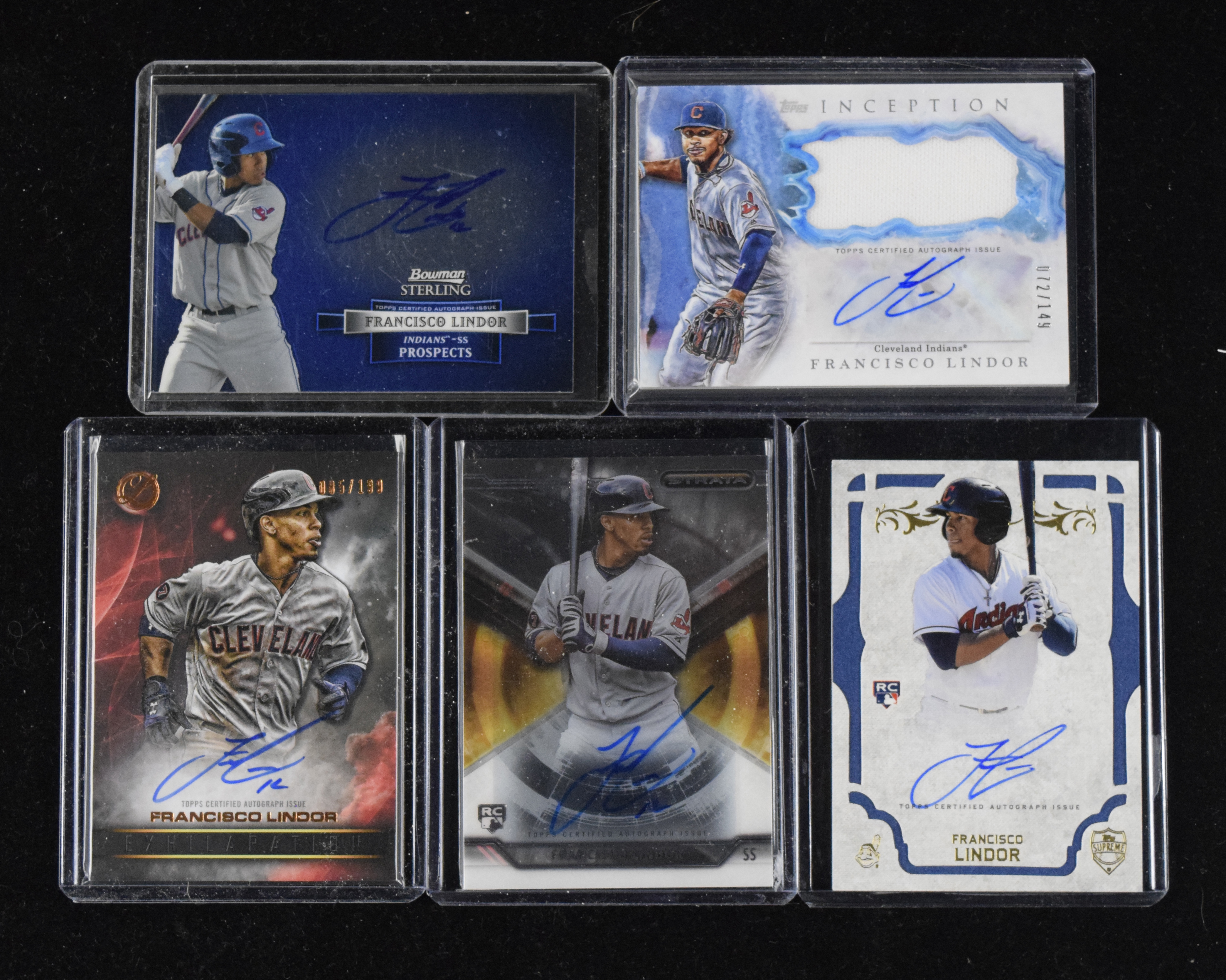 Description:Lot of (8) Francisco Lindor signed insert cards including serial numbered (NM-NM/MT). Includes 2012 Bowman Sterling "Prospect Autographs" #BSAP-FL signed by Lindor, 2015 Topps Strata "Autographs" #SA-FL signed by Lindor, 2015 Topps Supreme #SA-FL signed by Lindor, 2016 Topps Finest "Autographs" #FA-FL signed by Lindor, 2016 Topps Legacies Of Baseball "Exhilaration Autographs" #EA-FL signed by Lindor (#ed 85/199), 2016 Topps Tier One "Breakout Autographs" #BOA-FL signed by Lindor (#ed 139/199), 2017 Topps Gypsy Queen "Autographs" #GQA-FL signed by Lindor, and 2017 Topps Inception "Autograph Relics" #IAP-FL signed by Lindor (#ed 72/149). Signatures rate 8 to 10 out of 10: NM-NM/MT