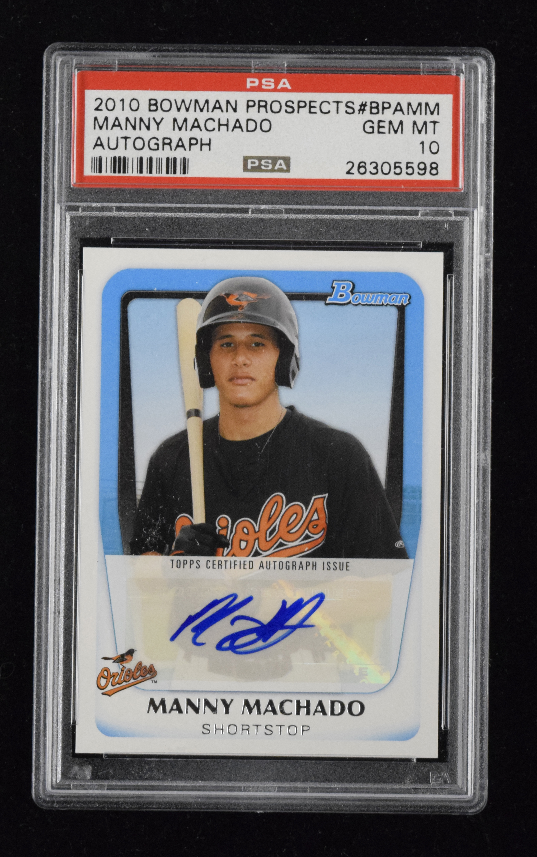 2011 Bowman "Prospect Autographs" #BPA-MM Manny Machado signed rookie insert card graded PSA 10 (GEM MINT).
