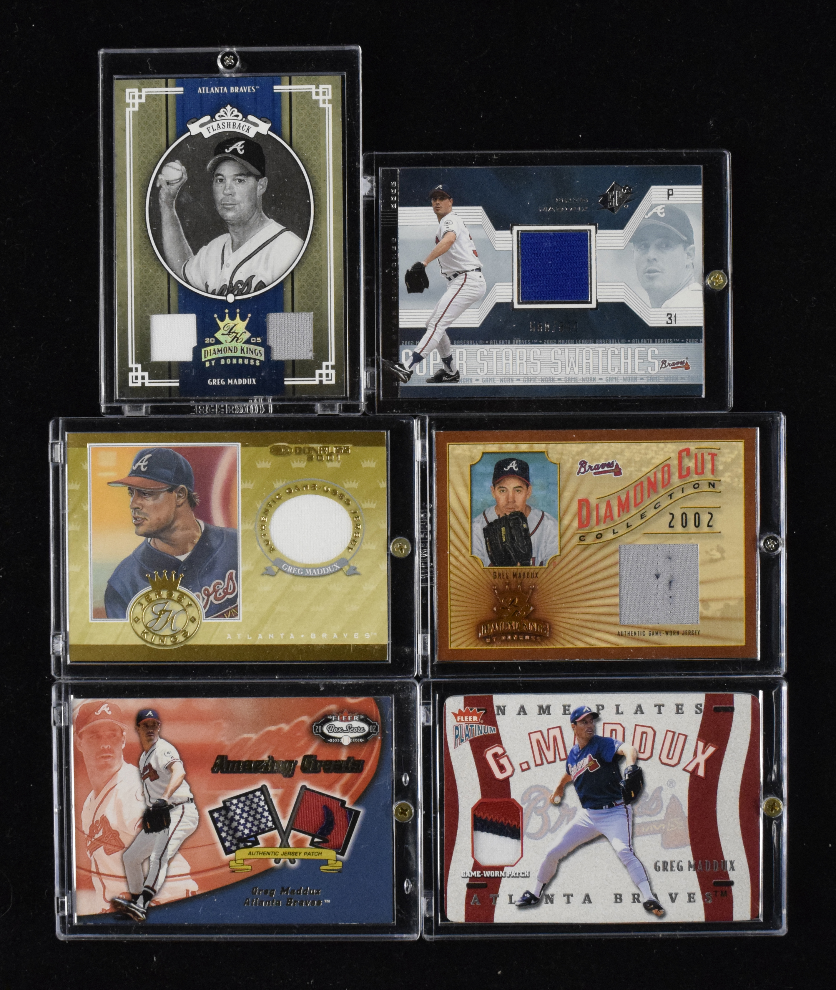 Description:Lot of (38) Greg Maddux gamed used relic swatch insert cards (NM-NM/MT overall). Includes (9) serial numbered: 6/50, 37/150, 193/200, 38/248, 21/250, 62/250, 273/375, 32/400, and 560/800. Various conditions throughout the lot, but most appear to average NM-NM/MT overall.