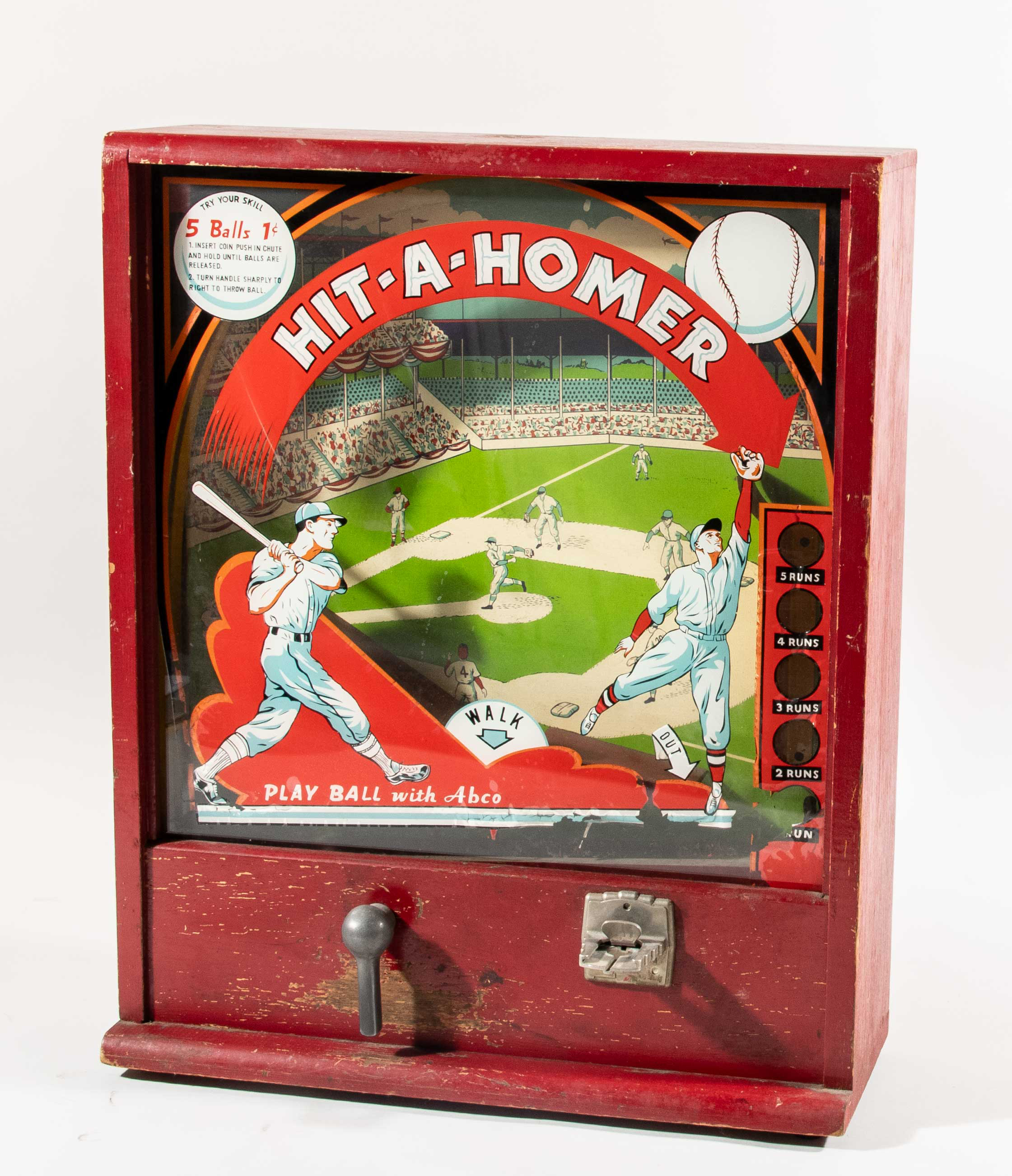 Description:Vintage "Hit a Homer" baseball coin operated game, c.1930-40s (VG). Approx. 5.5" deep x 18" wide x 22.5" tall wooden cased pinball table top game with colorful painted interior baseball playing field. Age and storage wear including some chipping/flaking to the housing which has two holes on top suggesting a header may be missing. Back painted glass has some additional chipping with a few larger areas of color loss and other flaws most notably impacting the lower right. Not currently functional, and the back panel lock has been removed: VG ($500-$750)