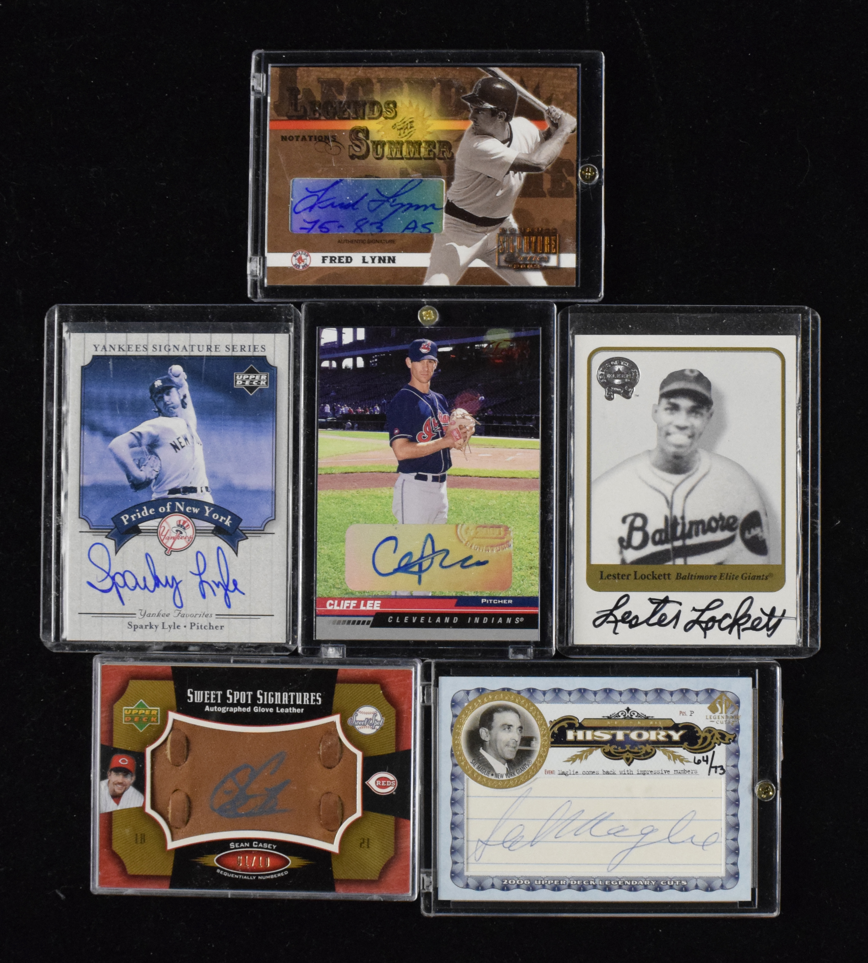 Description:Lot of (37) signed baseball insert cards (NM-NM/MT overall). Includes (2) Fred Lynn, Sal Maglie, (6) Sean Casey, Lester Lockett, Ron Cey, Chris Chambliss, (4) Cliff Lee, Kenny Lofton, Davey Lopes, (3) Sparky Lyle, (3) D.J. LeMahieu, Jon Lester, Tim Lincecum, Joe Carter, (3) Nick Castellanos, Starlin Castro, (2) Yoenis Cespedes, Tony Cingrani, Kenta Maeda, and (2) Francisco Liriano. Signatures rate 7 to 10 (avg 9) out of 10: NM-NM/MT overall