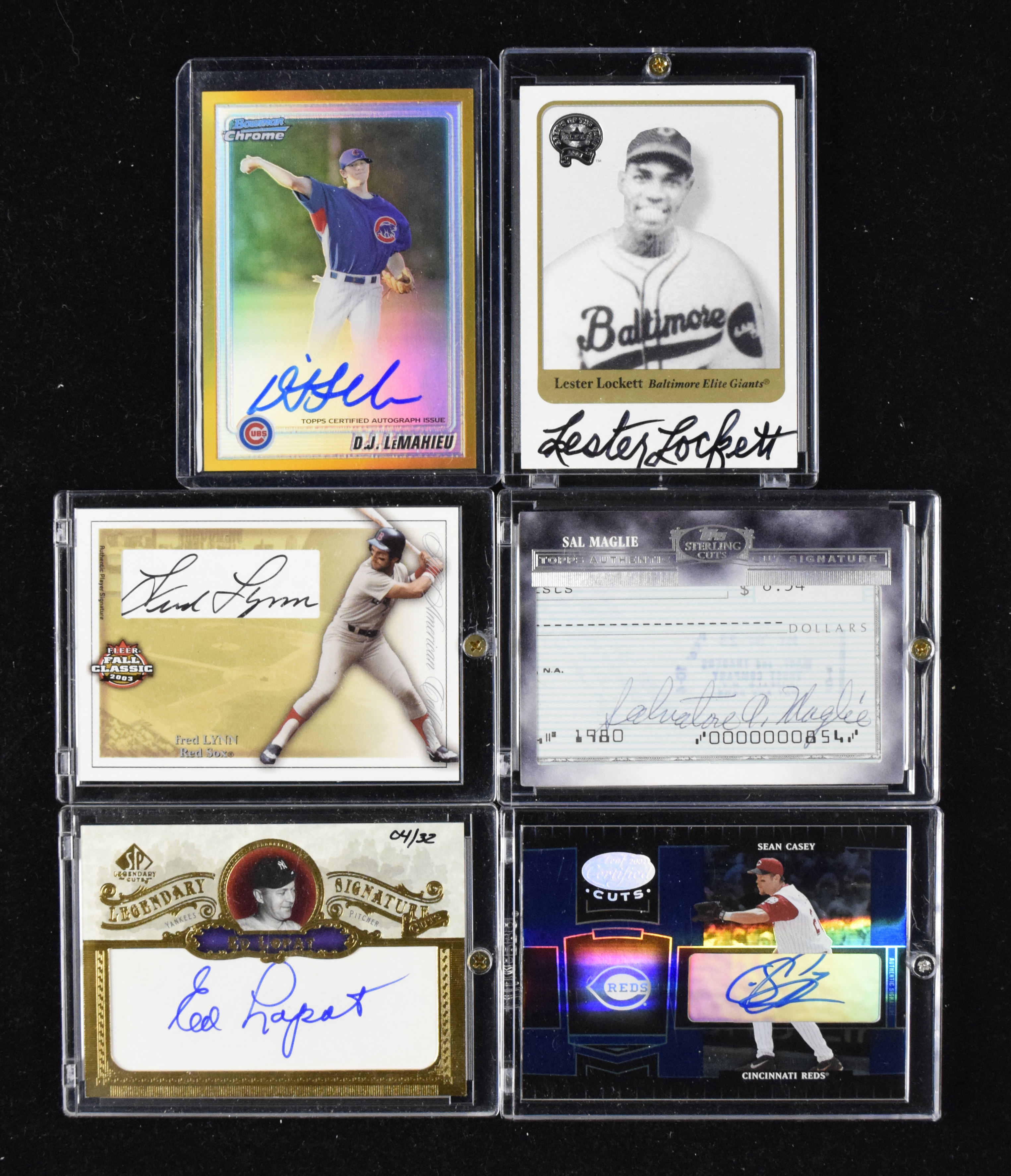 Description:Lot of (37) signed baseball insert cards (NM-NM/MT overall). Includes (2) Fred Lynn, Ed Lopat, Sal Maglie, Lester Lockett, (6) Sean Casey, Joe Carter, (4) Sparky Lyle, Chris Chambliss, (3) Cliff Lee, (5) D.J. LeMahieu, Tim Lincecum, Eric Chavez, (2) Nick Castellanos, Starlin Castro, (2) Yoenis Cespedes, Tony Cingrani, (2) Francisco Liriano, Kenta Maeda, and Rusney Castillo. Signatures rate 7 to 10 (avg 9) out of 10: NM-NM/MT overall