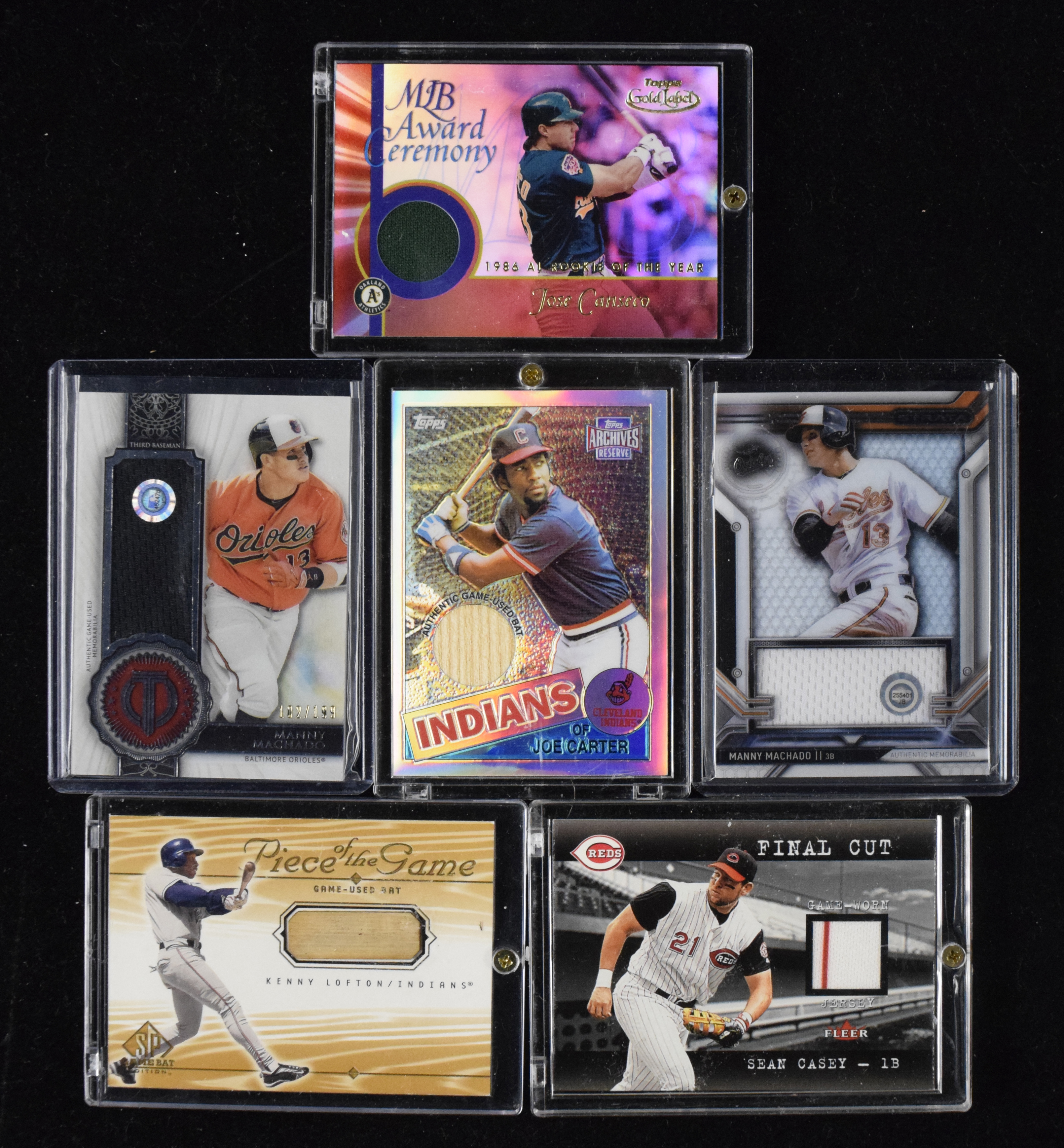 Description:Lot of (54) baseball game used relic swatch insert cards (NM-NM/MT overall). Includes (3) Manny Machado, Aroldis Chapman, (13) Jose Canseco, Evan Longoria, (4) Sean Casey, Joe Carter, (10) Kenny Lofton, (2) Derrek Lee, Tim Lincecum, Mike Lieberthal, Al Leiter, (4) Javy Lopez, (2) Eric Chavez, Adam Lind, Adam LaRoche, (3) Yoenis Cespedes, (3) Travis Lee, Francisco Liriano, and dual-relics card of Kenny Lofton / Andruw Jones: NM-NM/MT overall
