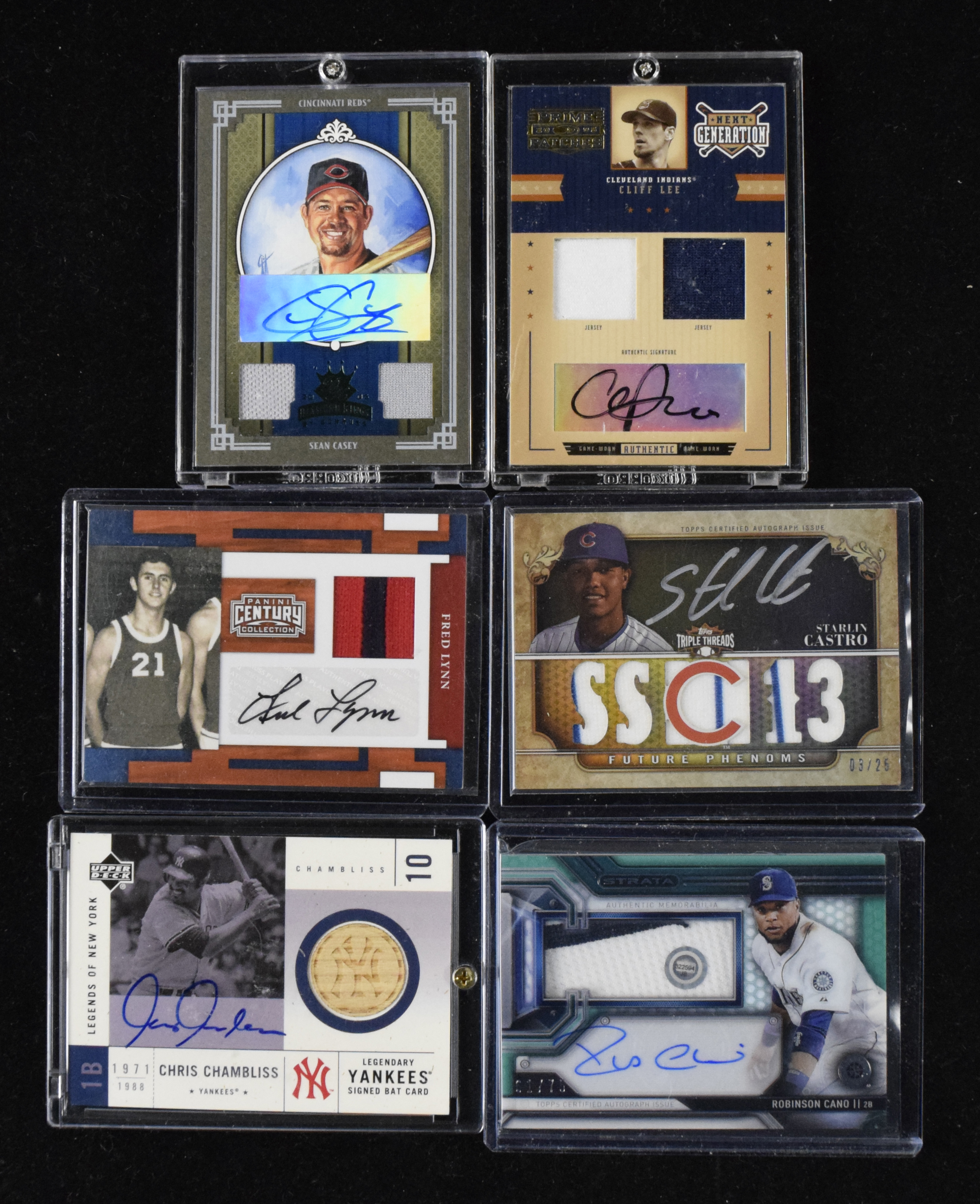 Description:Lot of (21) signed baseball relic swatch insert cards (NM-NM/MT overall). Includes Fred Lynn, (3) Sean Casey, Chris Chambliss, Cliff Lee, D.J. LeMahieu, Jon Lester, Robinson Cano, Andrew Miller, (2) Starlin Castro, Yoenis Cespedes, Devin Mesoraco, Austin Kearns, Corey Knebel, Jason Kubel, Adam Lind, Lastings Milledge, Ryan Meaux, and Colby Miller. Signatures rate 8 to 10 out of 10: NM-NM/MT overall