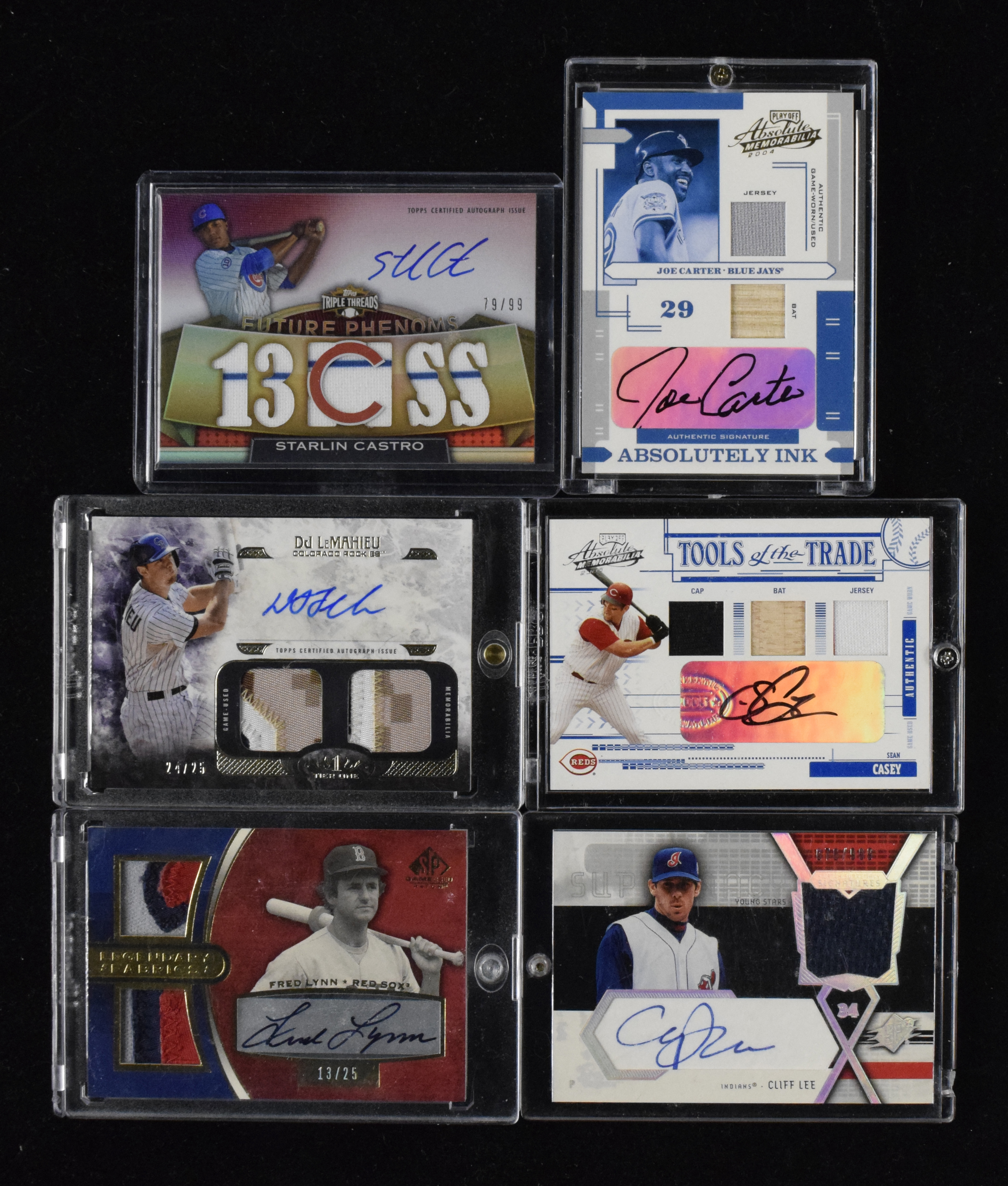 Description:Lot of (21) signed baseball relic swatch insert cards (NM-NM/MT overall). Includes Fred Lynn, Joe Carter, (2) Sean Casey, Cliff Lee, (2) D.J. LeMahieu, (2) Starlin Castro, (2) Yoenis Cespedes, Howie Kendrick, (2) Devin Mesoraco, Brett Lawrie, Adam Lind, Brad Miller, Tommy Milone, Casey Kotchman, Wade Miller, and Francisco Liriano. Signatures rate 8 to 10 out of 10: NM-NM/MT overall
