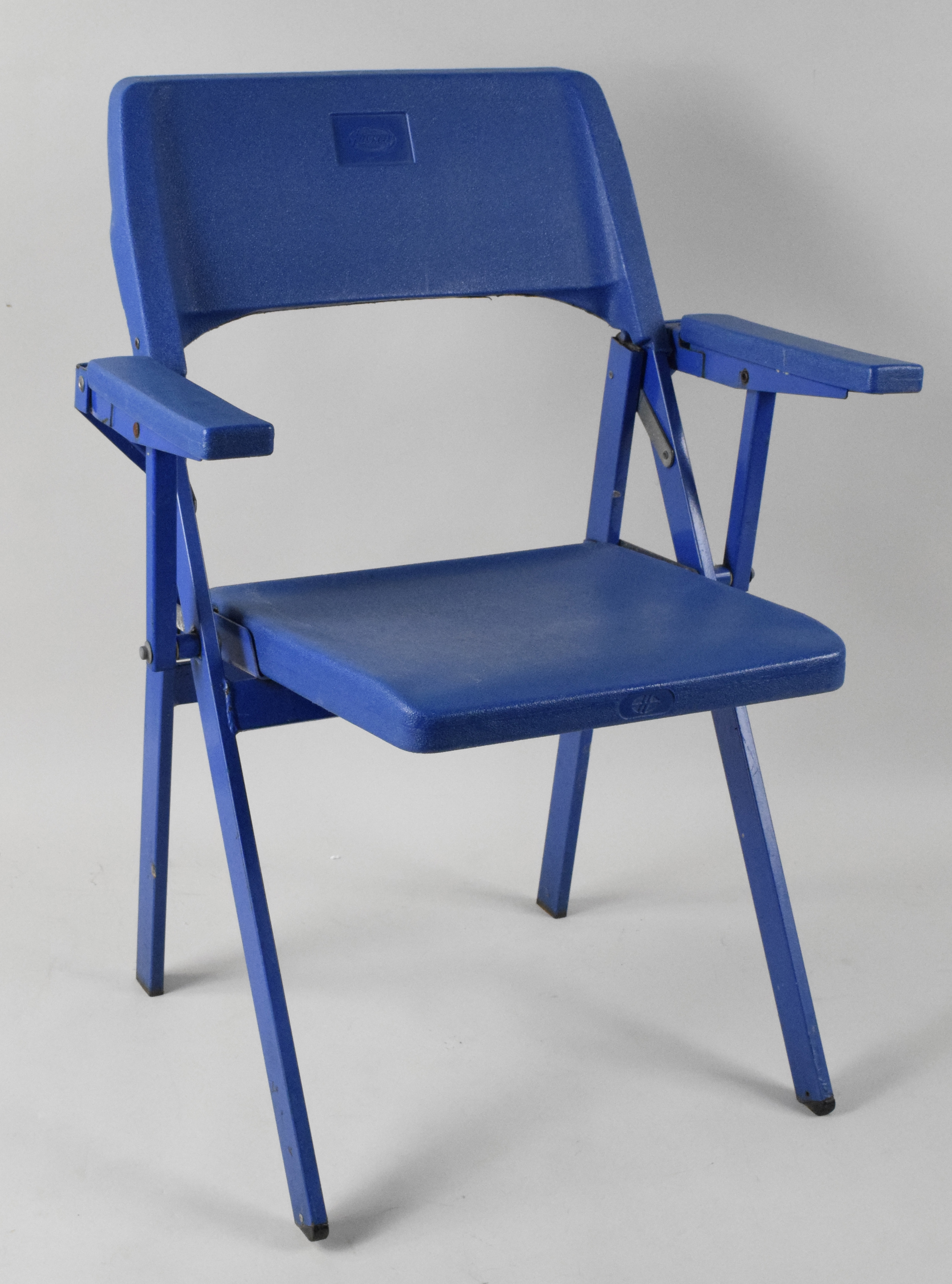 Description:Veterans Stadium folding chair - MLB Authenticated (EX). Blue metal and plastic folding chair removed from the stadium in 2003. Includes LOA from BC Sports, and MLB Authenticated serial #MT00219544 hologram sticker is on the chair. Expected wear with some scattered stains: EX