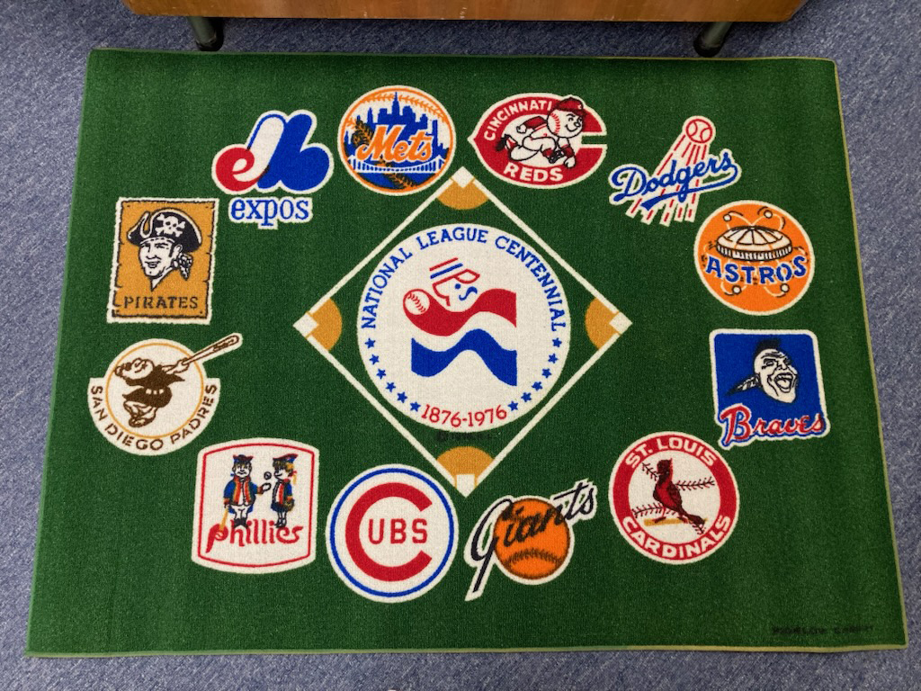 Description:1976 National League Centennial rug (EX/MT-NM). Measures approx. 3-feet by 4-feet, with NL team logos around the centennial logo at the center. Minimal wear: EX/MT-NM