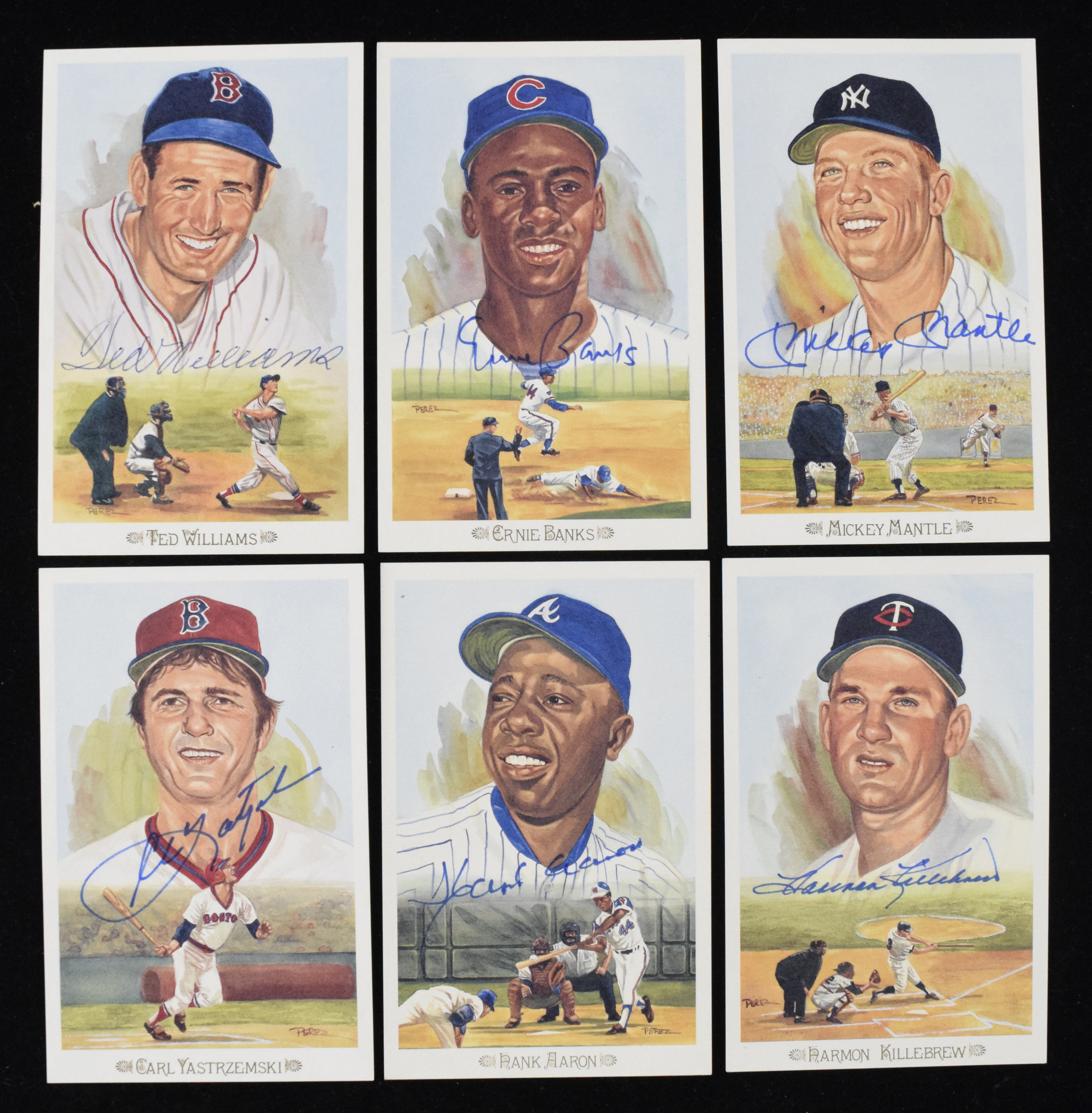 Description:1989 Perez-Steele Celebration set with (36) autographed including Mantle (Sigs. NM/MT-MT). Limited edition set #2715 of (44) cards (with original box) includes nearly all possible signers at the time with (36) cards individually signed by Hank Aaron, Luis Aparicio, Ernie Banks, Cool Papa Bell, Johnny Bench, Yogi Berra, Lou Boudreau, Ray Dandridge, Bill Dickey, Bobby Doerr, Rick Ferrell, Billy Herman, Jim Catfish Hunter, Monte Irvin, Al Kaline, George Kell, Harmon Killebrew, Ralph Kiner, Bob Lemon, Buck Leonard, Mickey Mantle, Juan Marichal, Eddie Mathews, Willie McCovey, Johnny Mize, Stan Musial, Pee Wee Reese, Brooks Robinson, Joe Sewell, Enos Slaughter, Duke Snider, Warren Spahn, Willie Stargell, Billy Williams, Ted Williams and Carl Yastrzemski. Marker signatures rate 8/9 out of 10 overall, while cards appear NM. Celebration set box has some wear: VG/EX. ($750-$1,250)