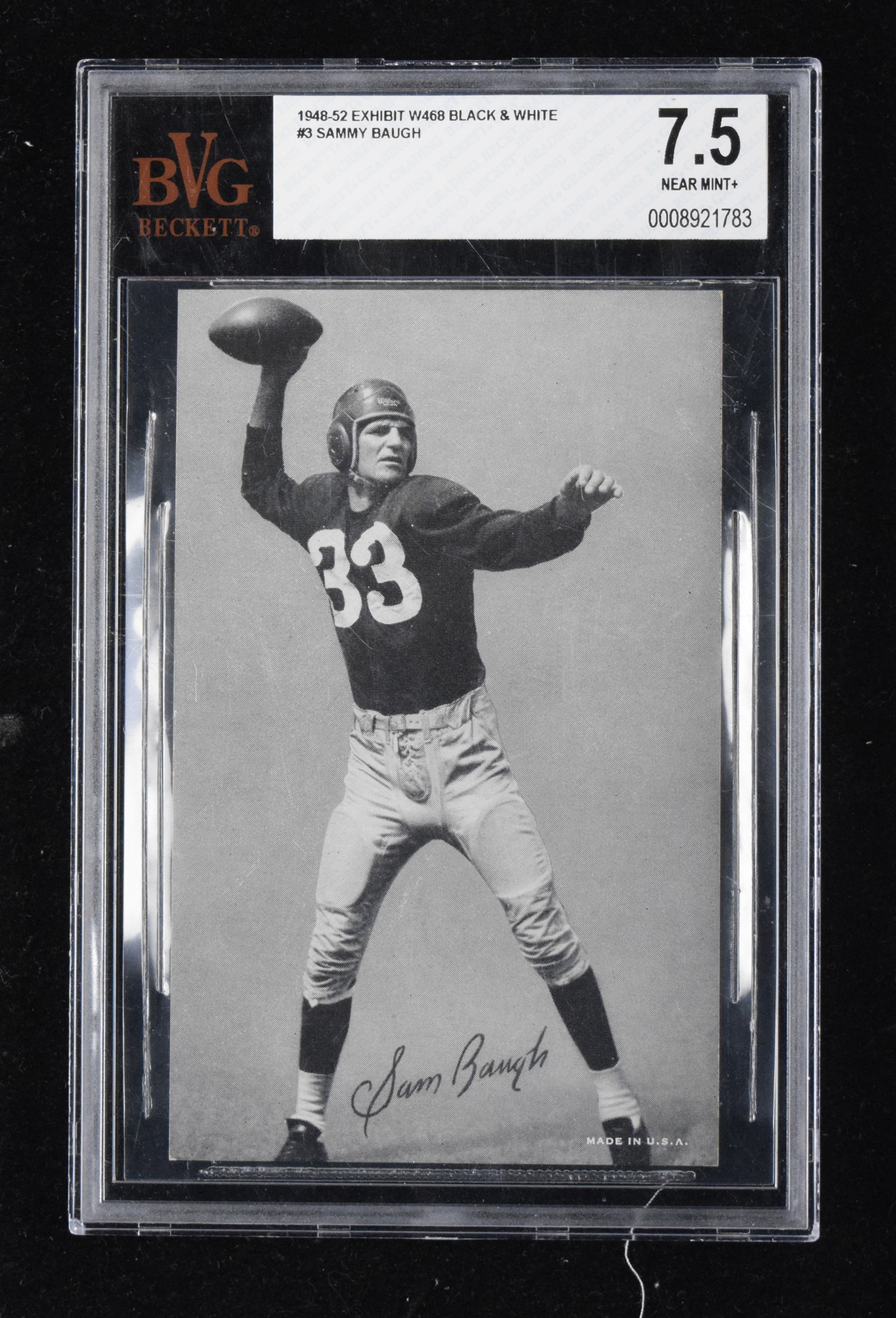 Description:1948-52 W468 Exhibit B&W Sammy Baugh (BVG 7.5 NM+). Very nice Exhibit card of the Hall of Famer is nicely centered with light touches of wear to the corners. Blank back is clean: BVG 7.5 NM+.