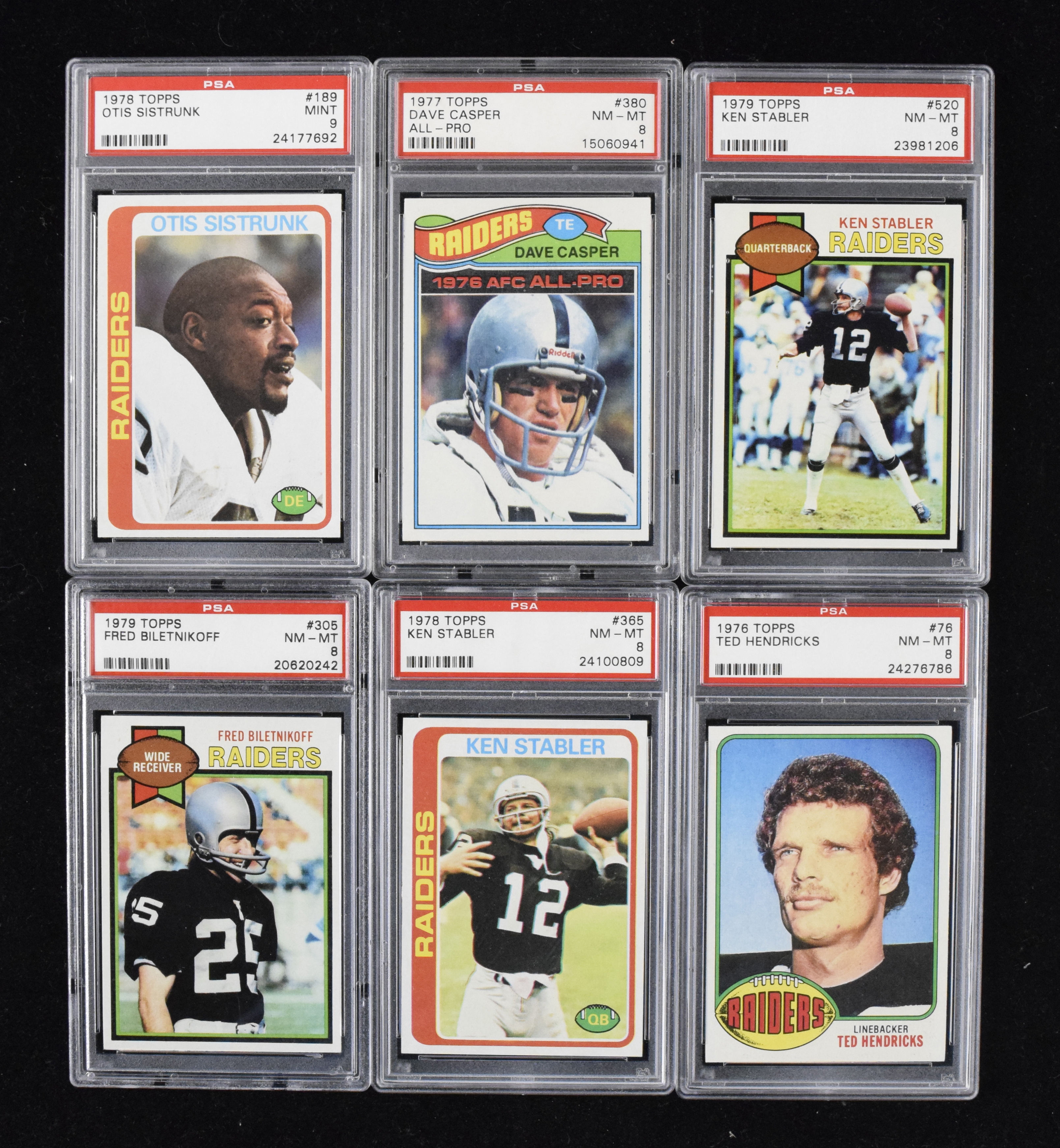 Description:Lot of (11) 1976-1979 Topps Raiders cards with Stabler, Casper RC, all graded PSA 8-9 (NM/MT-MT). High-grade lot of Topps Oakland Raiders cards, with (10) PSA 8 NM/MT: (2) 1976 Topps: #s 50 Ray Guy and 76 Ted Hendricks; (2) 1977 Topps: #s 380 Dave Casper and 295 Fred Biletnikoff; (2) 1978 Topps: #s 365 Ken Stabler and 68 Ted Hendricks and (4) 1979 Topps: #s 345 Ted Hendricks, 305 Fred Biletnikoff, 460 Dave Casper RC and 520 Ken Stabler, along with (1) PSA 9 MT: 1978 Topps #189 Otis Sistrunk. Range: PSA 8 NM/MT - PSA 9 MT.