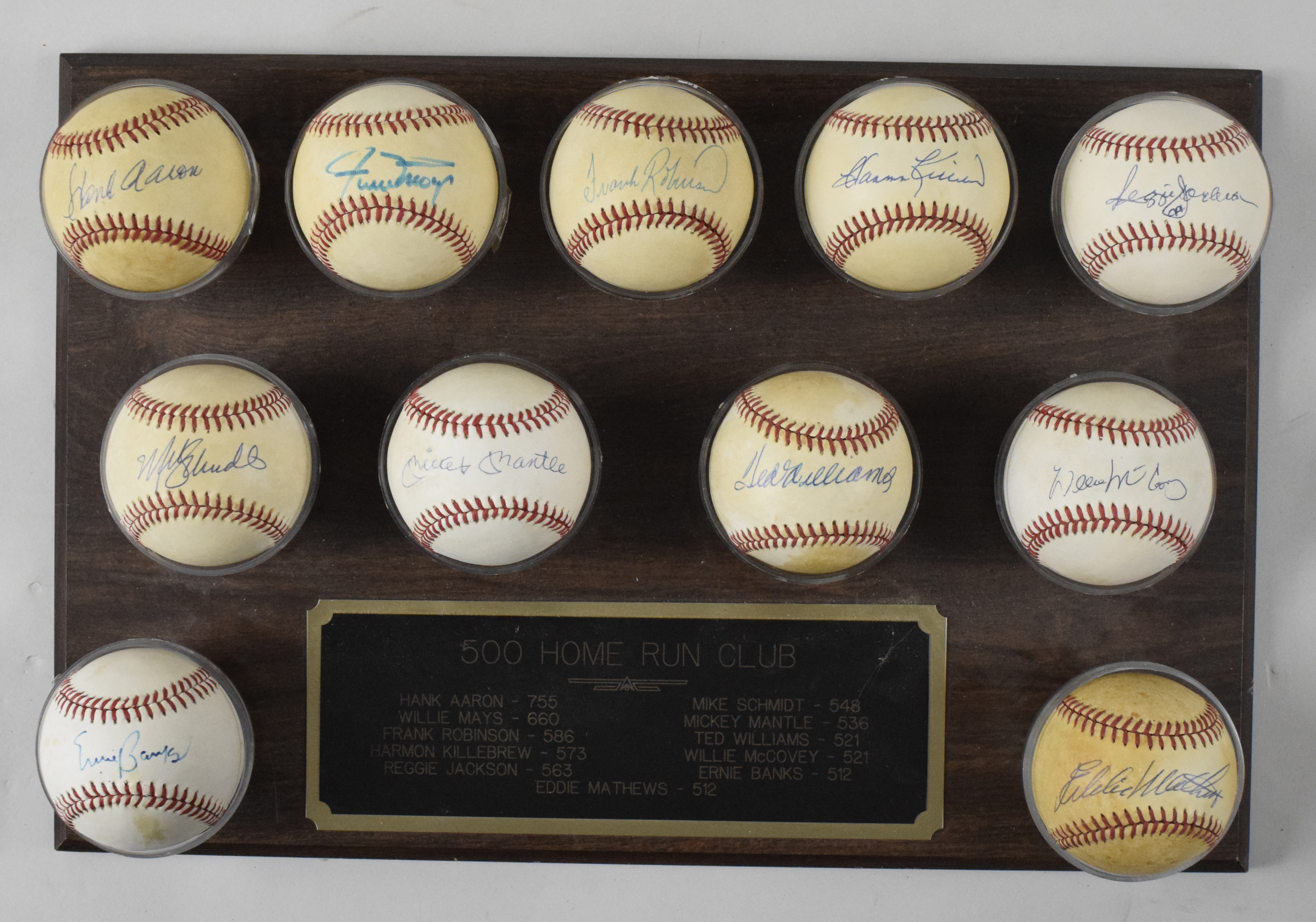 Description:500 Home Run Club single-signed baseball display with (11) including Mantle, Williams (Sigs. NM/MT-MT). Fine assemblage of (11) single-signed baseballs from members of the revered 500 Home Run Club. Each player has signed the sweet spot of either a N.L. or A.L. baseball in blue ink or maker. Players include Mickey Mantle, Willie Mays, Ted Williams, Frank Robinson, Mike Schmidt, Ernie Banks, Eddie Mathews, Willie McCovey, Harmon Killebrew, Hank Aaron and Reggie Jackson. Signatures rate 8/9 out of 10 with balls ranging from lightly to heavily toned (with Mathews and Aaron the most heavily toned). Balls are mounted (removable) to a 12"x18" wooden plaque display with "500 Home Run Club" plate: EX. ($1,000-$2,000)
