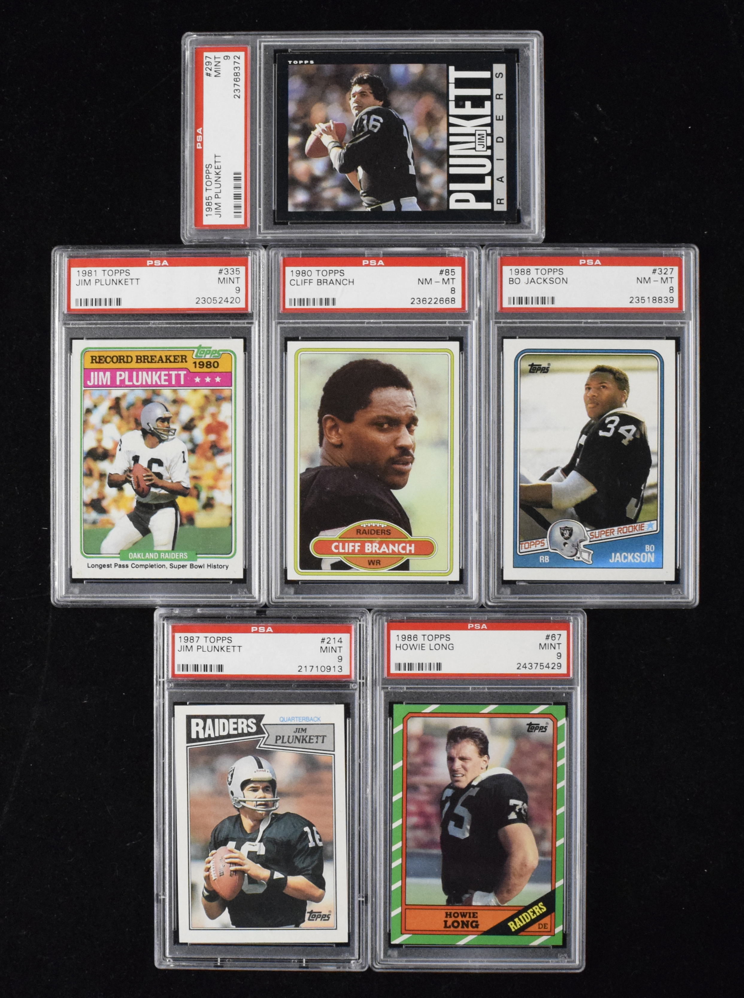 Description:Lot of (18) 1980-1988 Raiders graded cards, including Bo Jackson RC (PSA 8 NM/MT - PSA 9 MT). High-grade lot of Oakland Raiders cards, with (10) PSA 8 NM/MT: (2) 1980 Topps: #s 85 Cliff Branch & 429 Jack Tatum; (4) 1981 Topps: #s 487, 449, 107 and 510 Ray Guy; (1) 1984 Topps: # 113; (1) 1985 Topps: #288 Ray Guy; (1) 1986 Topps: #69 Ray Guy and (1) 1988 Topps: #327 Bo Jackson RC; (7) PSA 9 MT: (3) 1981 Topps: #s 186 Ray Guy, 20 and 335 Jim Plunkett RB; (2) 1985 Topps: #s 297 Jim Plunkett and 290; (1) 1986 Topps #67 Howie Long and (1) 1987 Topps #214 Jim Plunkett, along with (1) BGS 8 NM/MT: 1984 Topps #98 Marcus Allen. Range: PSA 8 NM/MT - PSA 9 MT.