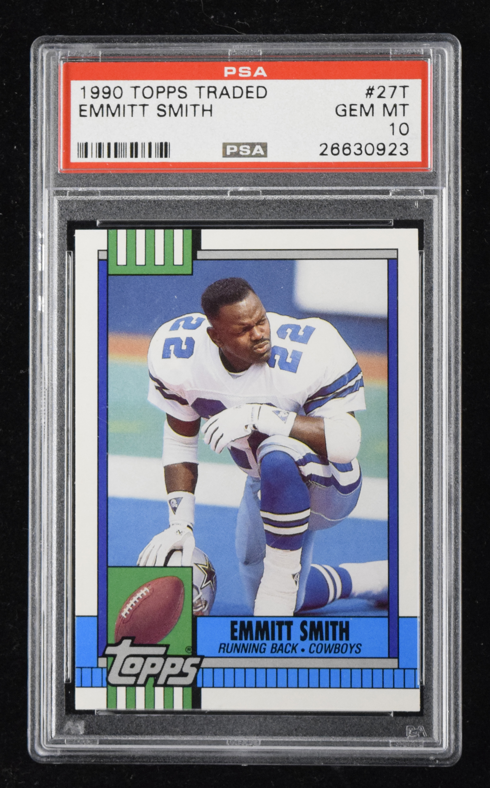 Description:1990 Topps Traded #27T Emmitt Smith RC (PSA 10 GEM MT). Ultra high-grade rookie card of the all-time rushing leader is perfectly centered with four razor-sharp corners and crisp registration. Back is clean: PSA 10 GEM MT.