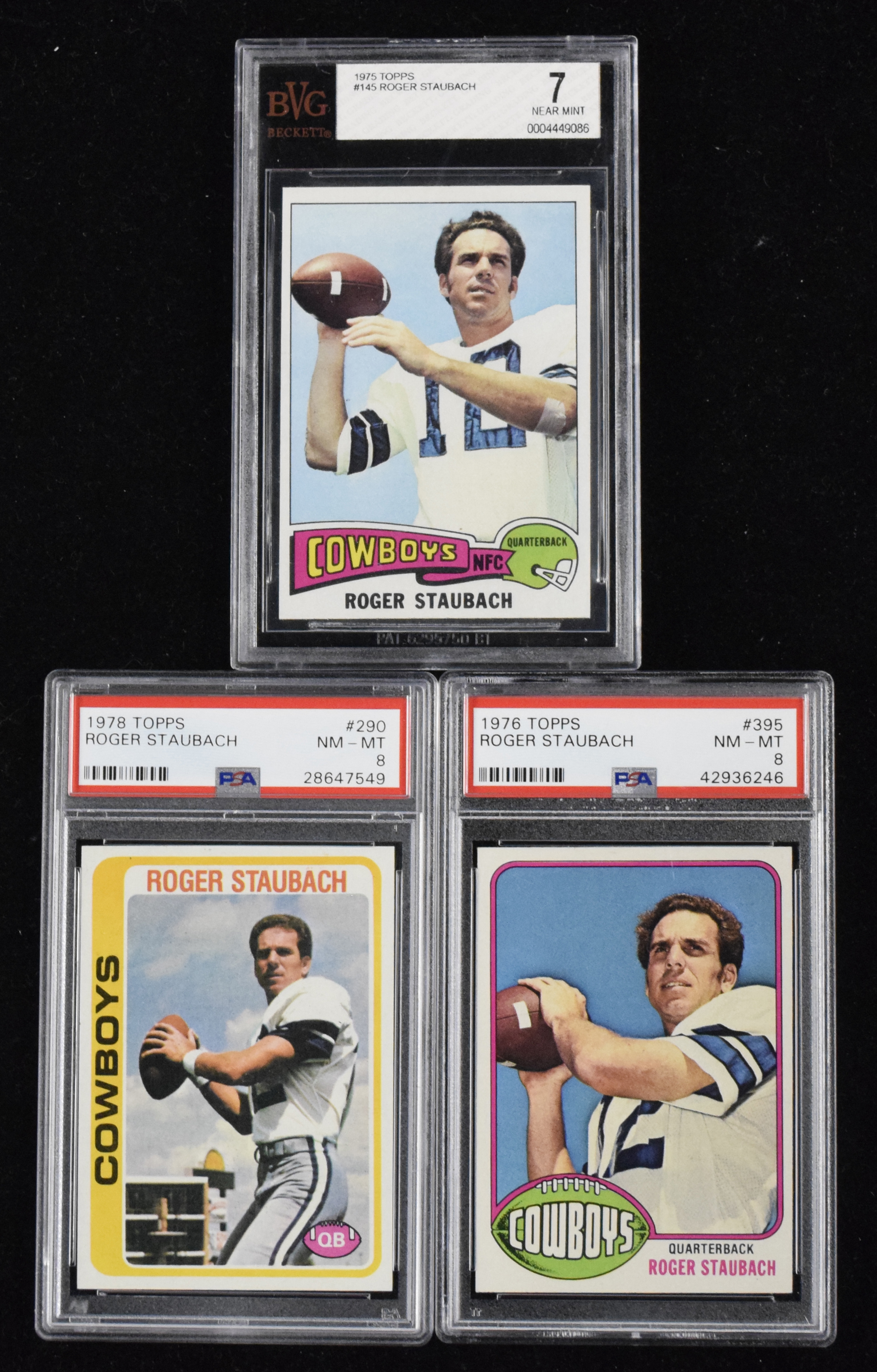 Lot of (3) 1975-1978 graded Roger Staubach cards (BVG 7 NM - PSA 8 NM/MT). Lot includes (2) PSA 8 NM/MT: 1976 Topps #395 and 1978 Topps #290; and (1) BVG 7 NM: 1975 Topps #145. Range: BVG 7 NM - PSA 8 NM/MT.