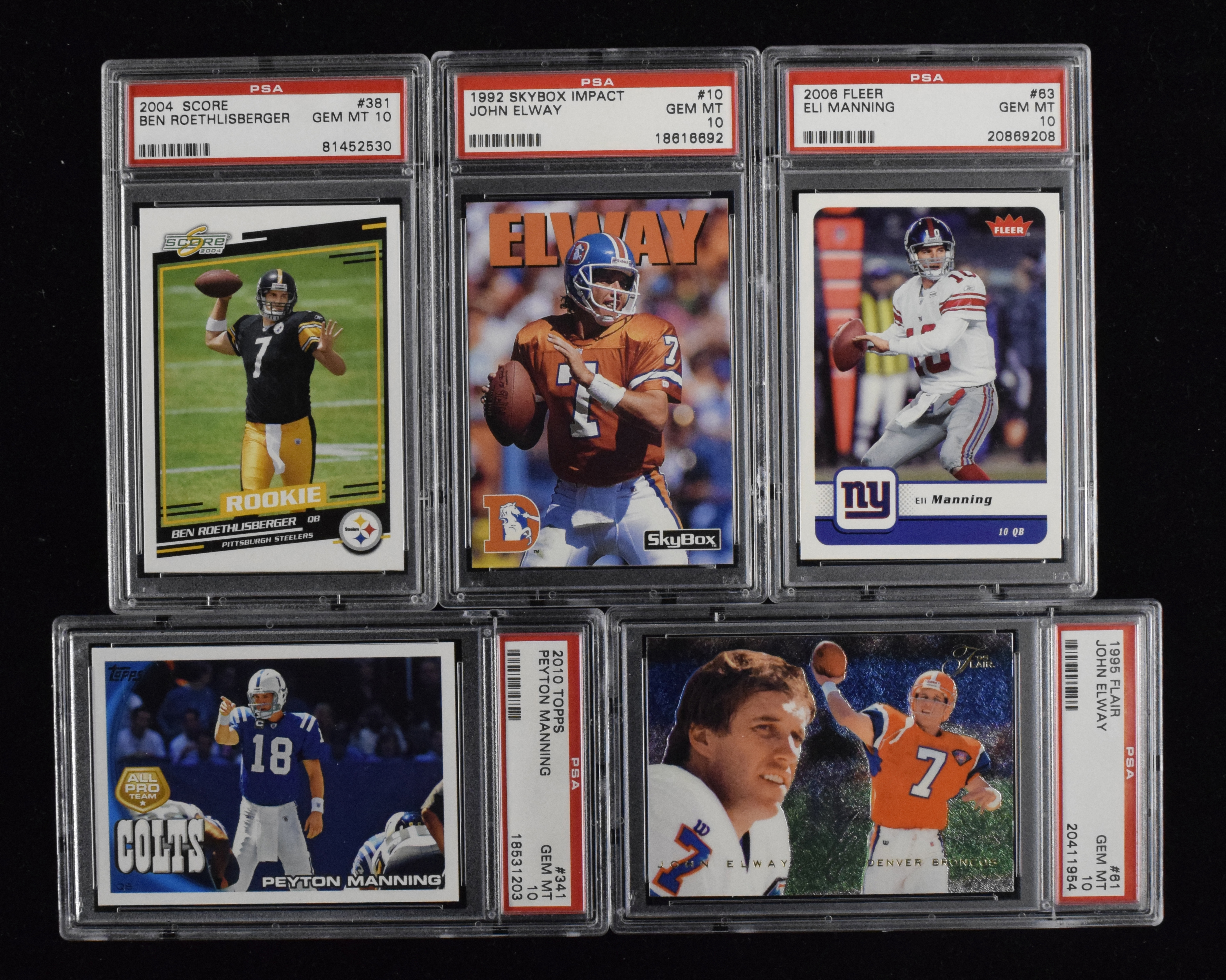 Description:Lot of (10) 1980-2010 FB cards, with Roethlisberger RC, Manning & Elway, all graded PSA 10 (GEM MT). Ultra high-grade lot of modern cards, each of which has been graded PSA 10 GEM MT. Includes 1989 Topps #241 John Elway, 1991 Upper Deck #75 John Elway checklist, 1991 Score #410 John Elway, 1992 Skybox Impact #10 John Elway, 1995 Flair #61 John Elway, 1996 Collector's Choice #116 John Elway, 2004 Score #381 Ben Roethlisberger RC, 2007 Upper Deck #79 Peyton Manning, 2006 Fleer #63 Eli Manning and 2010 Topps #341 Peyton Manning. Range: PSA 10 GEM MT.
