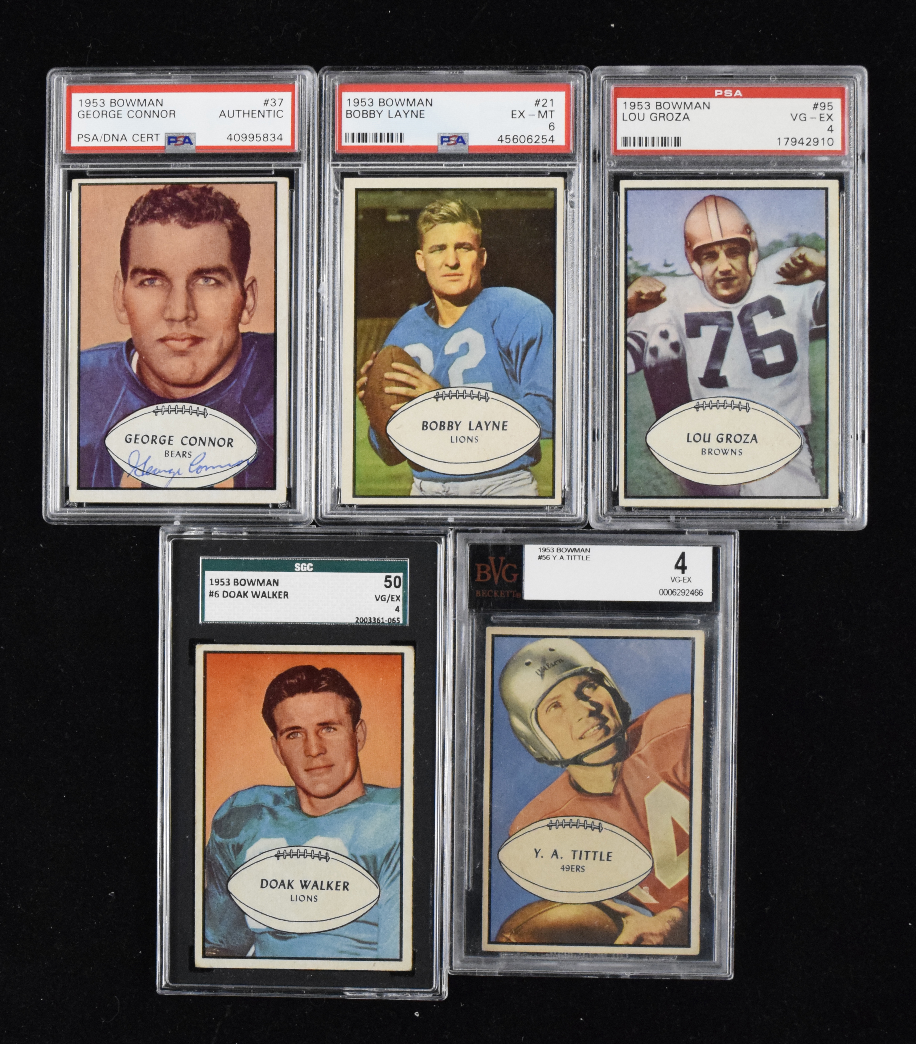 Lot of (5) 1953 Bowman graded HOFers, with Tittle, Walker and Layne (PSA/DNA Auth. - PSA 6 EX/MT). Nice assortment of graded Hall of Famers from the 1953 Bowman set, with #21 Bobby Layne (PSA 6 EX/MT), 37 George Connor autographed card (PSA/DNA Authentic; card: VG/EX OC); 6 Doak Walker (SGC 4 VG/EX), 95 Lou Groza (PSA 4 VG/EX) and 56 Y.A. Tittle (BVG 4 VG/EX). Range: PSA/DNA Authentic - PSA 6 EX/MT.