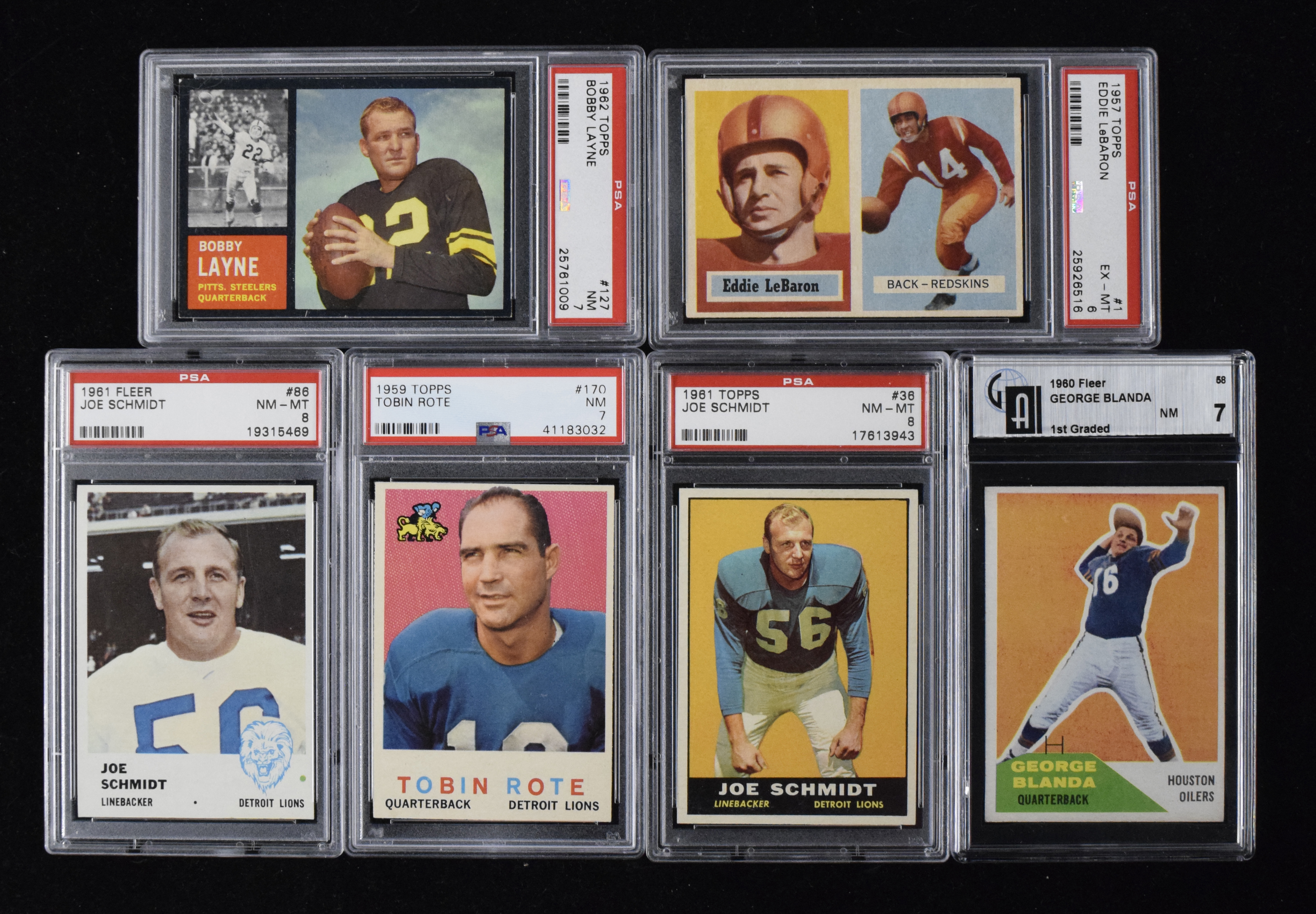Lot of (10) 1957-1962 graded FB cards, including Blanda and Layne (PSA 6 EX/MT - PSA 8 NM/MT). Lot includes (2) 1957 Topps with (2) #1 Eddie Lebaron (BVG 6.5 EX/MT+ and PSA 6 EX/MT); (1) 1960 Fleer #58 George Blanda (in GAI holder, appears EX/MT); (1) 1961 Fleer #86 Joe Schmidt (PSA 8 NM/MT); (1) 1958 Topps: #130 Gordon Soltau (PSA 5 EX); (3) 1959 Topps: #s 170 Tobin Rote (PSA 7 NM), 165 Jim Podley (PSA 7 NM) and 6 Joe Schmidt (PSA 6.5 EX/MT+); (1) 1961 Topps #38 Joe Schmidt (PSA 8 NM/MT) and (1) 1962 Topps: #127 Bobby Layne (PSA 7 NM). Range: PSA 6 EX/MT - PSA 8 NM/MT.
